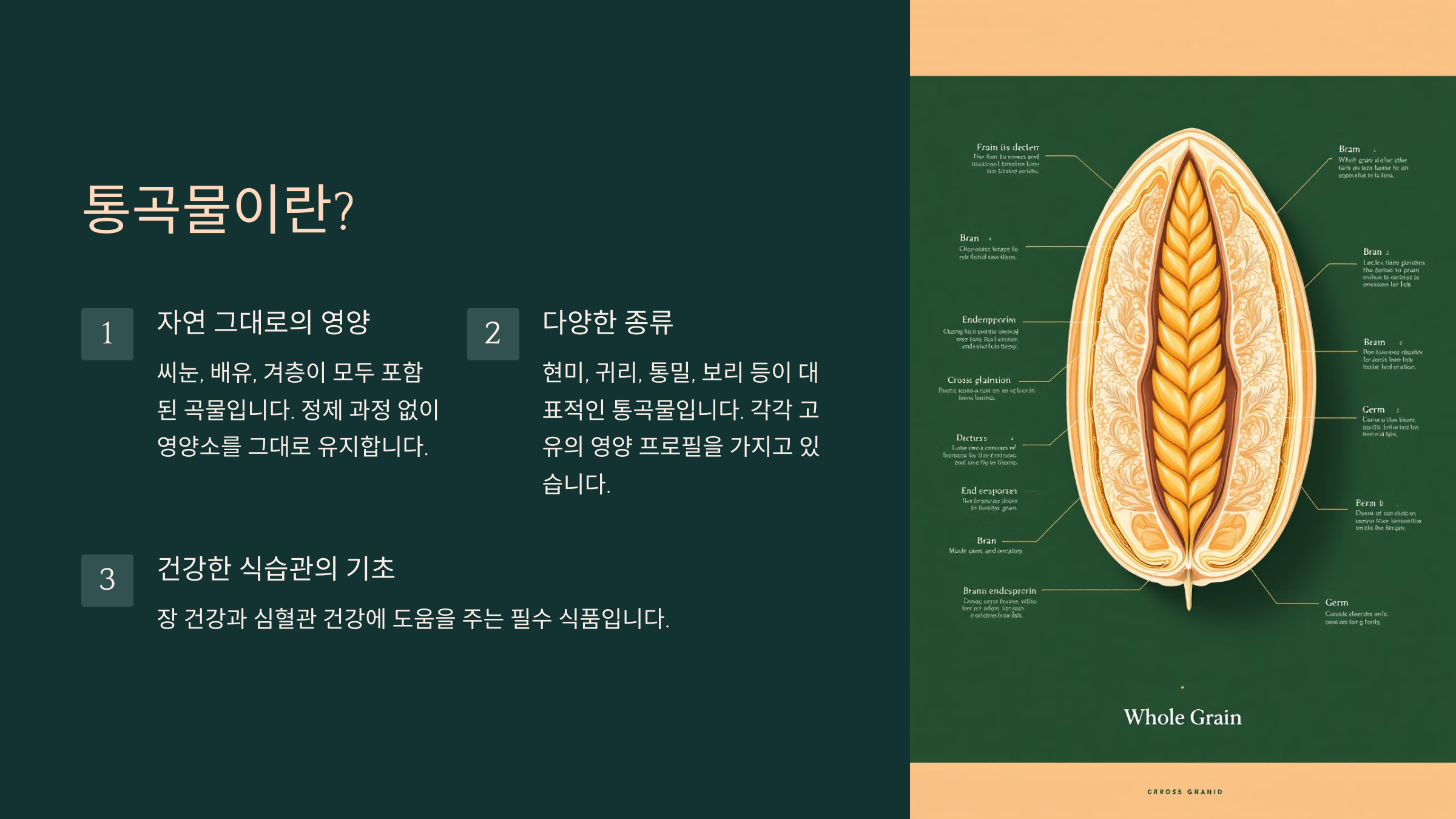🌾 통곡물은 곡물의 씨눈(배아), 배유, 겨층이 모두 포함된 곡물을 말해요. 정제 곡물과 달리 자연 그대로의 영양소를 유지하고 있어 건강에 많은 이점을 제공해요.