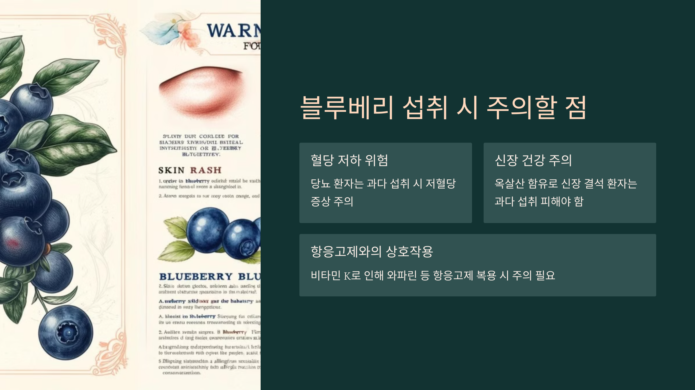 블루베리에는 **옥살산**이 함유되어 있어 신장 결석이 있는 사람은 과다 섭취를 피하는 것이 좋아요.