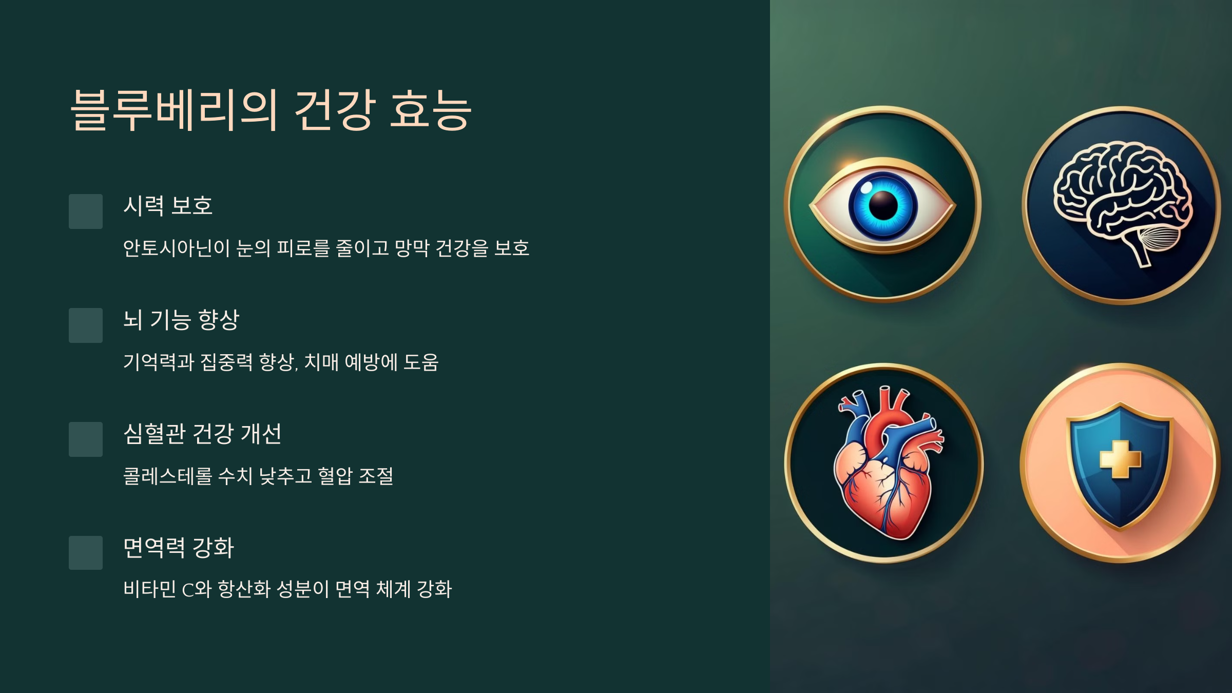 블루베리는 강력한 항산화 성분을 함유한 대표적인 슈퍼푸드예요. 꾸준히 섭취하면 면역력 강화, 뇌 건강 증진, 심혈관 건강 보호 등 다양한 효능을 기대할 수 있어요.
