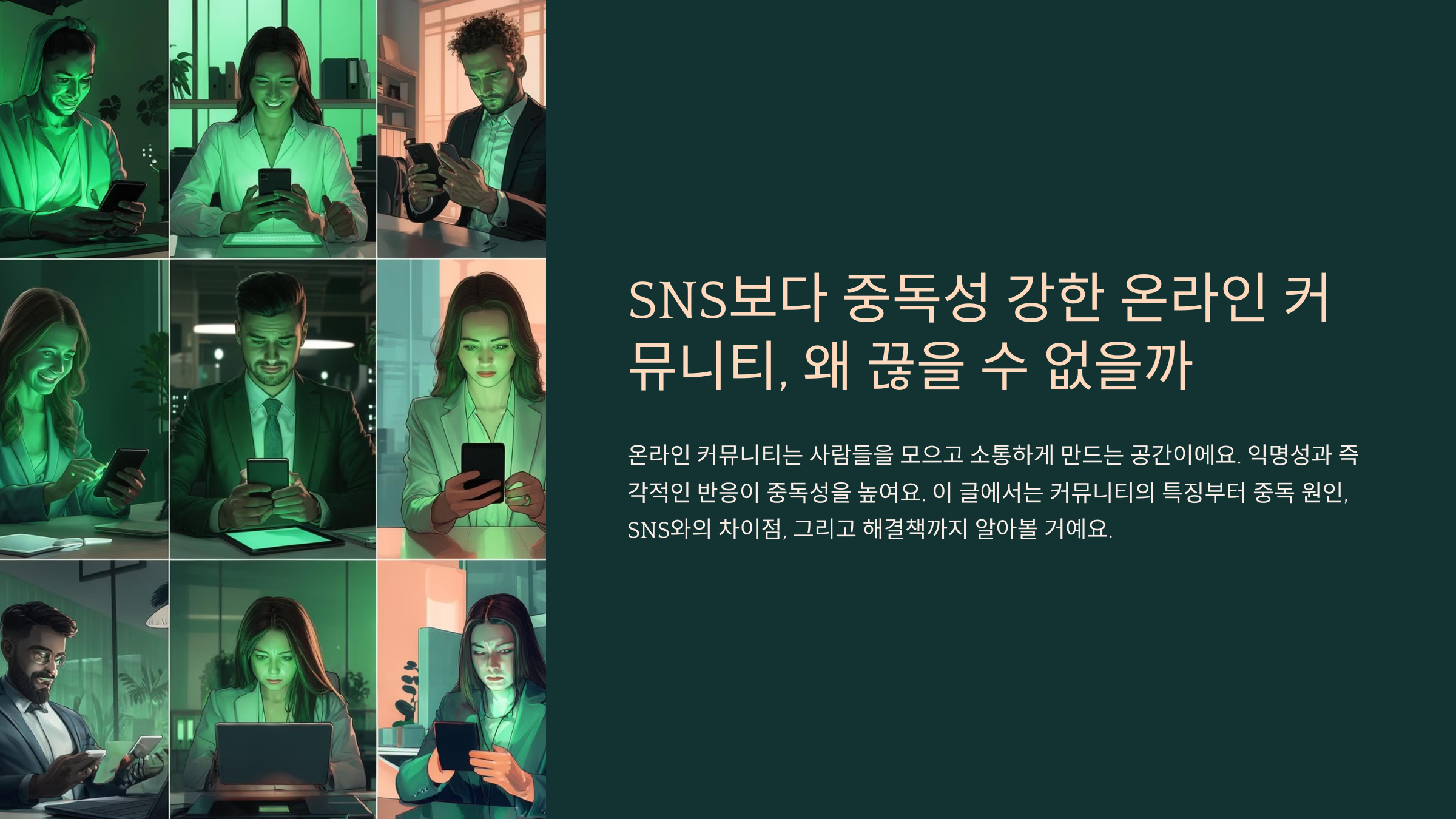 온라인 커뮤니티가 SNS보다 더 중독적인 이유는 그 특유의 구조와 사용자 경험 때문이에요. 커뮤니티에서는 개인의 정체성보다 '공동체'의 일부로 느껴지기 때문에 심리적으로 더 강하게 끌리게 되죠.