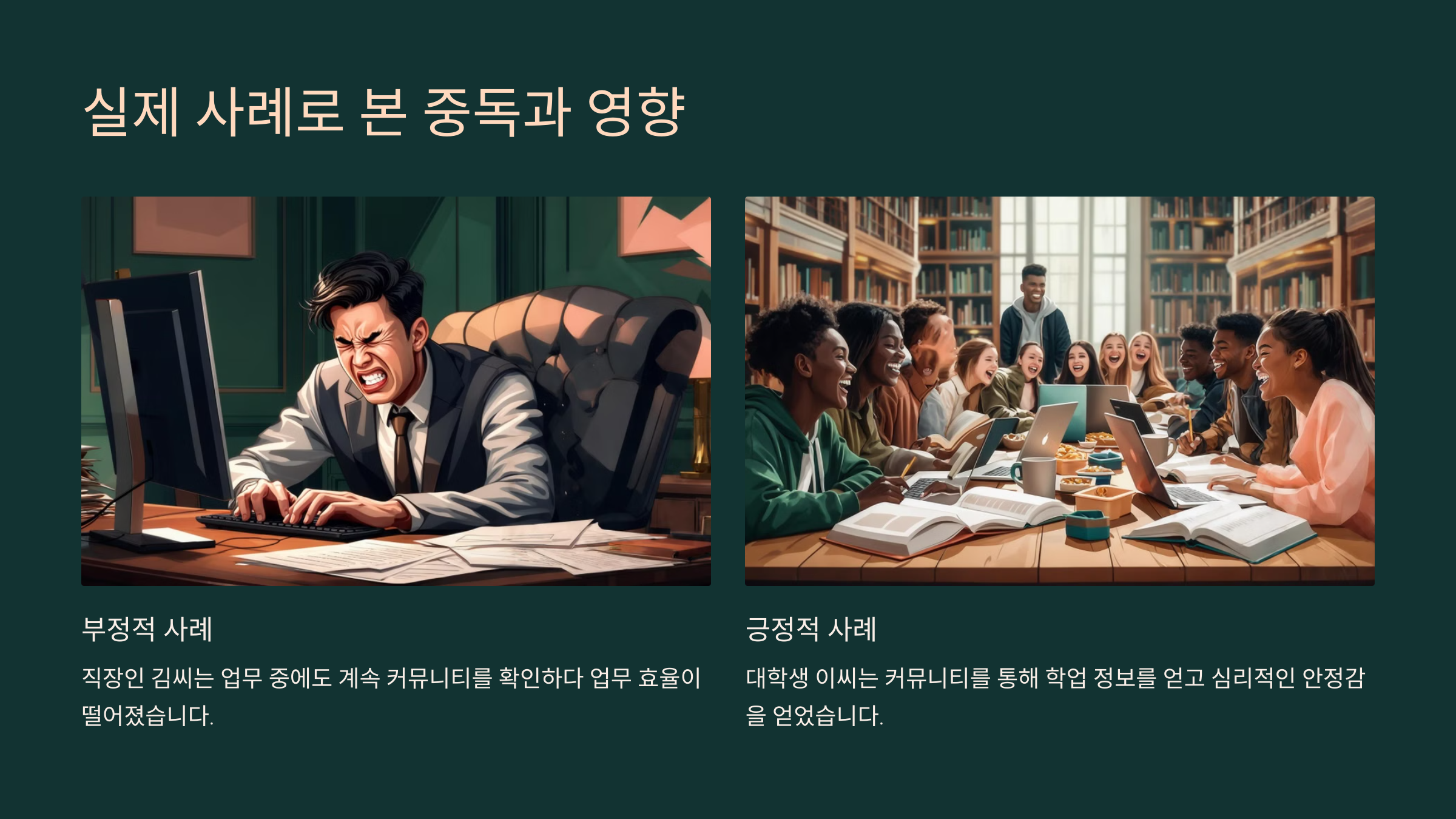온라인 커뮤니티 중독은 단순히 시간을 낭비하는 문제가 아니에요. 실제로 많은 사람들이 커뮤니티에 과도하게 빠져들면서 학업, 직장 생활, 인간관계에 부정적인 영향을 받고 있죠. 하지만 모든 영향이 부정적인 것만은 아니에요.