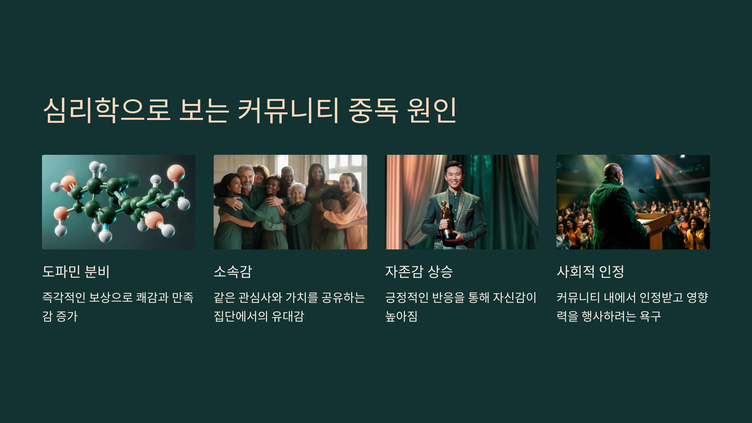 도파민 분비 | 댓글과 추천으로 인한 즉각적인 보상으로 쾌감과 만족감 증가 |