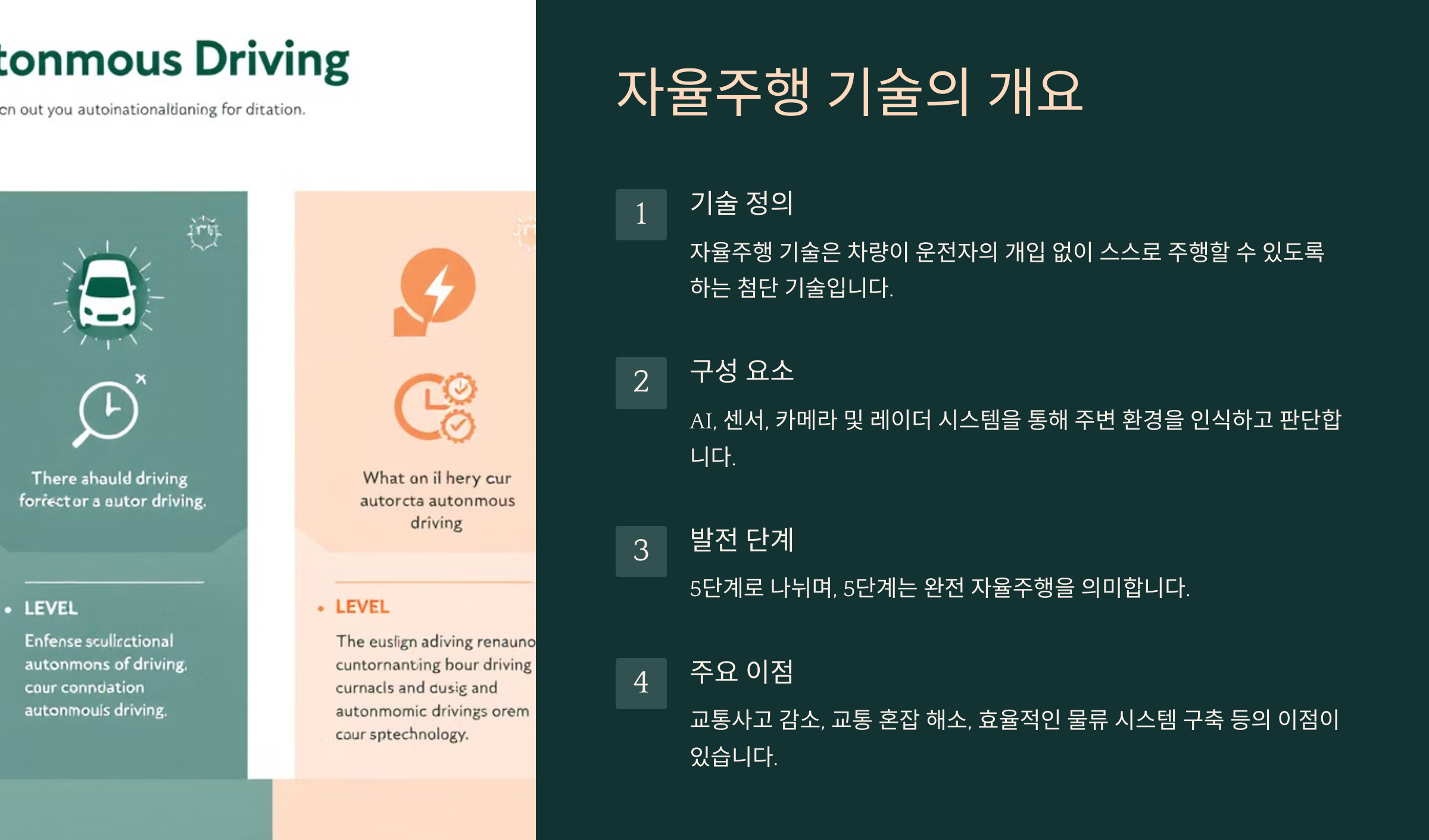 자율주행 기술은 차량이 운전자의 개입 없이 스스로 주행할 수 있도록 하는 첨단 기술입니다.