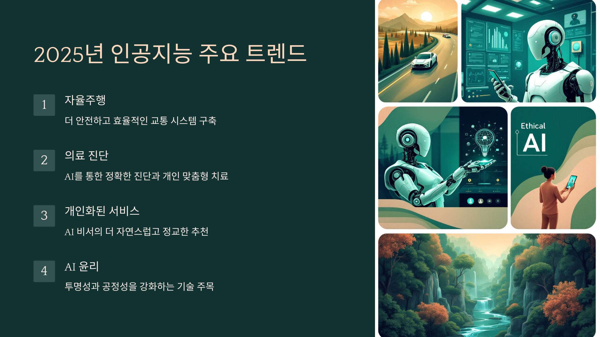내 생각엔 2025년에는 AI가 단순히 기술을 넘어서 인간의 창의성과 협력하며 더 나은 세상을 만드는 도구로 자리 잡을 것 같아요. 특히 의료 분야에서는 AI가 더 정확한 진단을 내리고 개인 맞춤형 치료를 제공해 건강한 삶을 돕게 될 거예요.