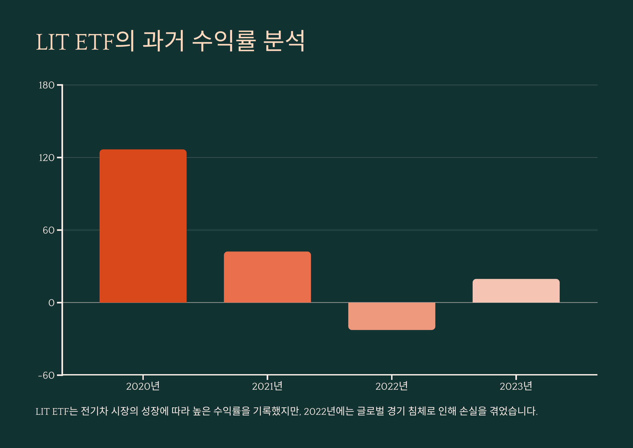 LIT ETF는 전기차와 에너지 저장 시스템에 대한 수요가 증가하면서 장기적으로 높은 수익을 기록해왔어요. 특히 전기차 시장이 급성장한 2020년에는 무려 +126.5%의 수익률을 기록했죠. 하지만 2022년에는 글로벌 경기 침체와 공급망 이슈로 인해 -22.9%의 손실을 봤어요.