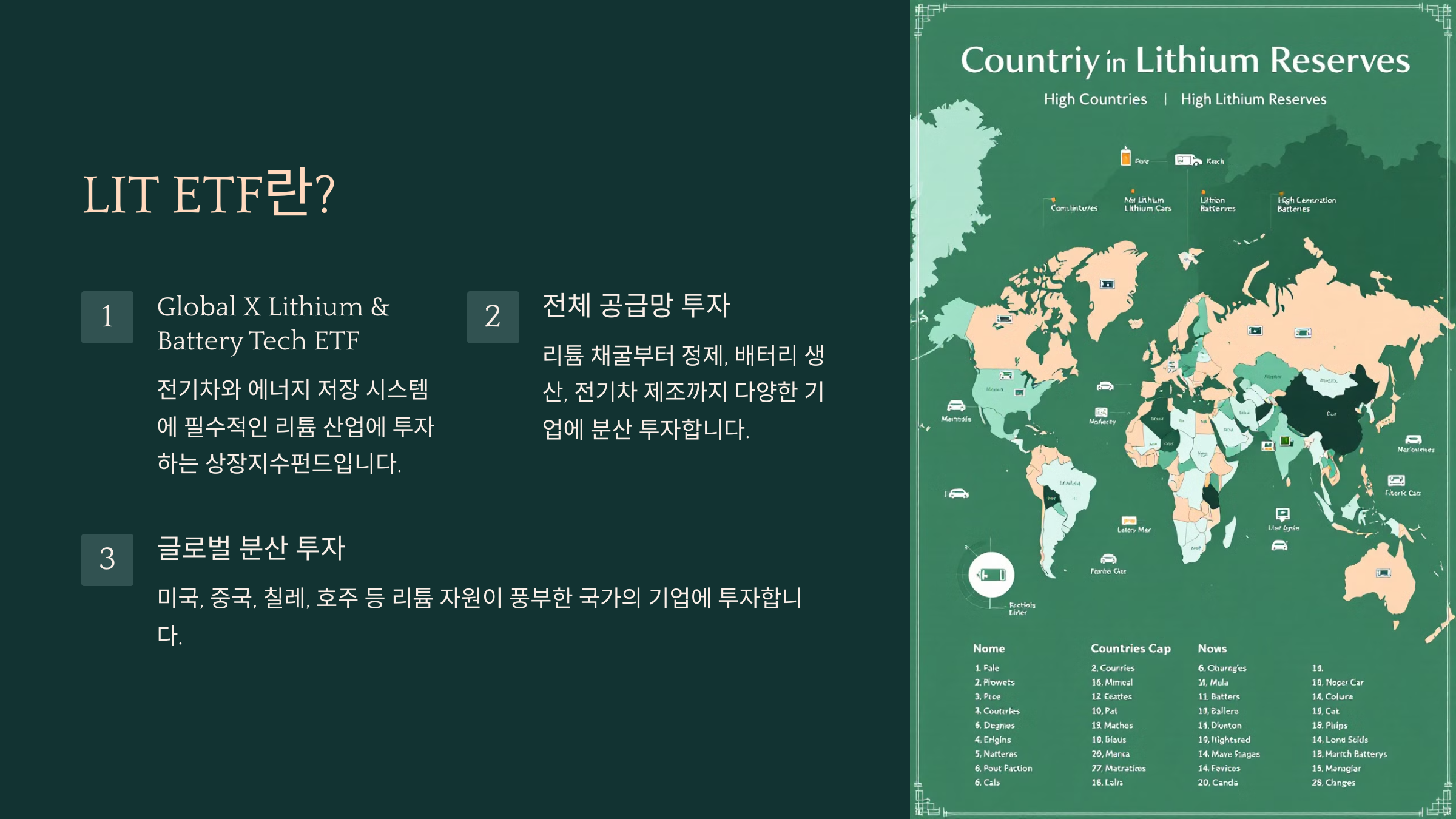 이 ETF의 가장 큰 장점은 글로벌 분산 투자예요. 미국뿐 아니라 중국, 칠레, 호주 등 리튬 자원이 풍부한 국가의 기업에도 투자하므로, 특정 지역의 리스크에 덜 영향을 받는답니다. 🌍🚗🔋