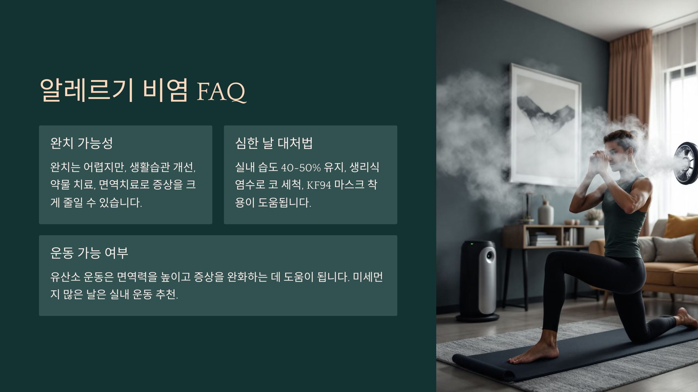 A7. 네! 유산소 운동은 면역력을 높이고 비염 증상을 완화하는 데 도움이 돼요. 다만, 미세먼지 농도가 높은 날에는 실내 운동을 추천해요.