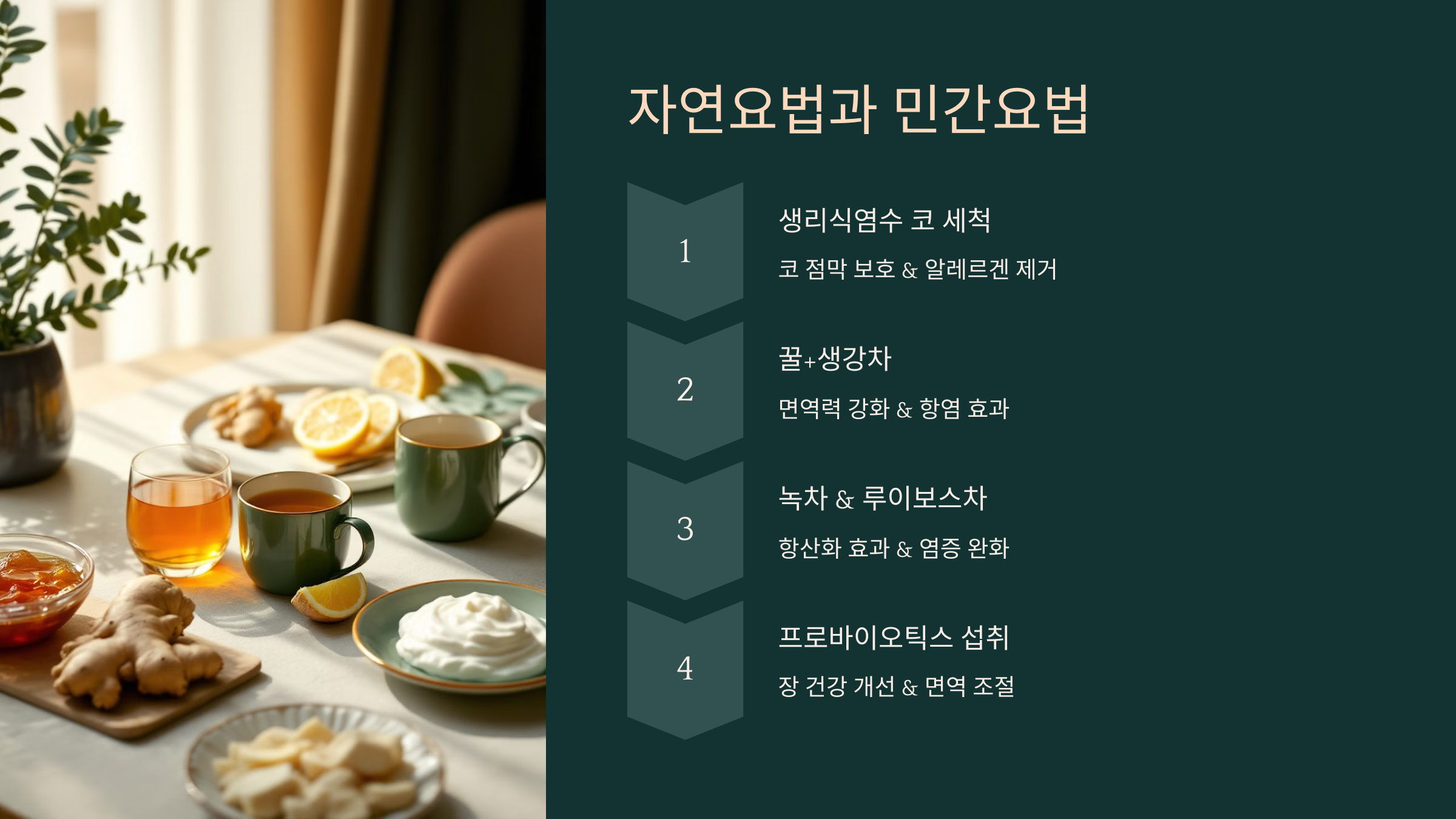 약물 치료가 부담스럽다면 자연적인 방법으로 비염을 완화할 수도 있어요. 생활 속에서 쉽게 실천할 수 있는 자연요법과 민간요법을 알아볼까요? 🍵