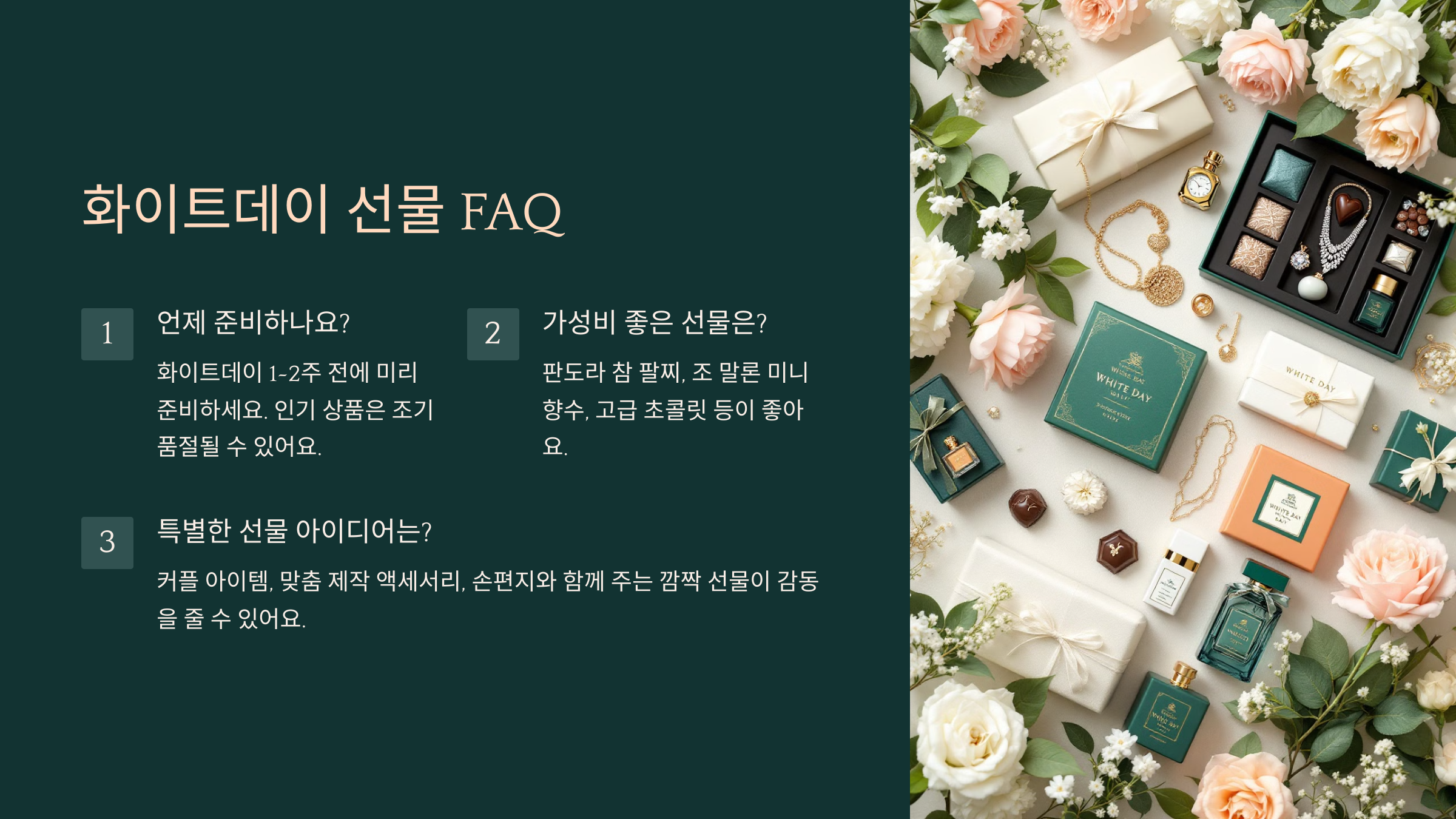 💫 향수는 여자친구가 매일 사용할 수 있는 감각적인 선물이죠! 이제 화이트데이 선물 추천 FAQ를 살펴보면서 완벽한 선물을 고르는 팁을 확인해 볼까요? 🎁💕