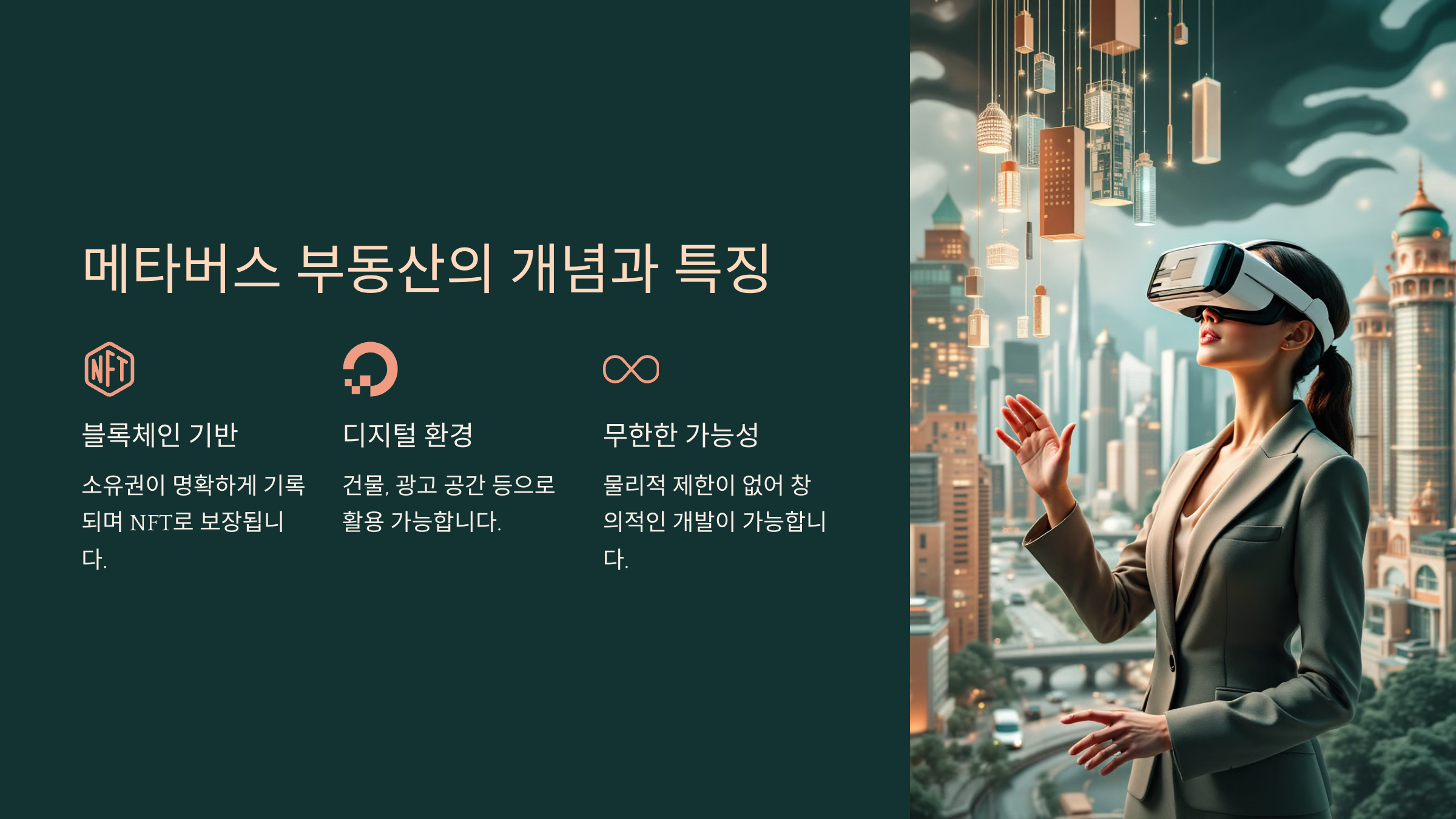 메타버스 부동산은 가상세계에서 디지털 토지를 사고파는 개념이에요. 블록체인 기술을 기반으로 하며, NFT(대체 불가능한 토큰)로 소유권이 보장돼요.