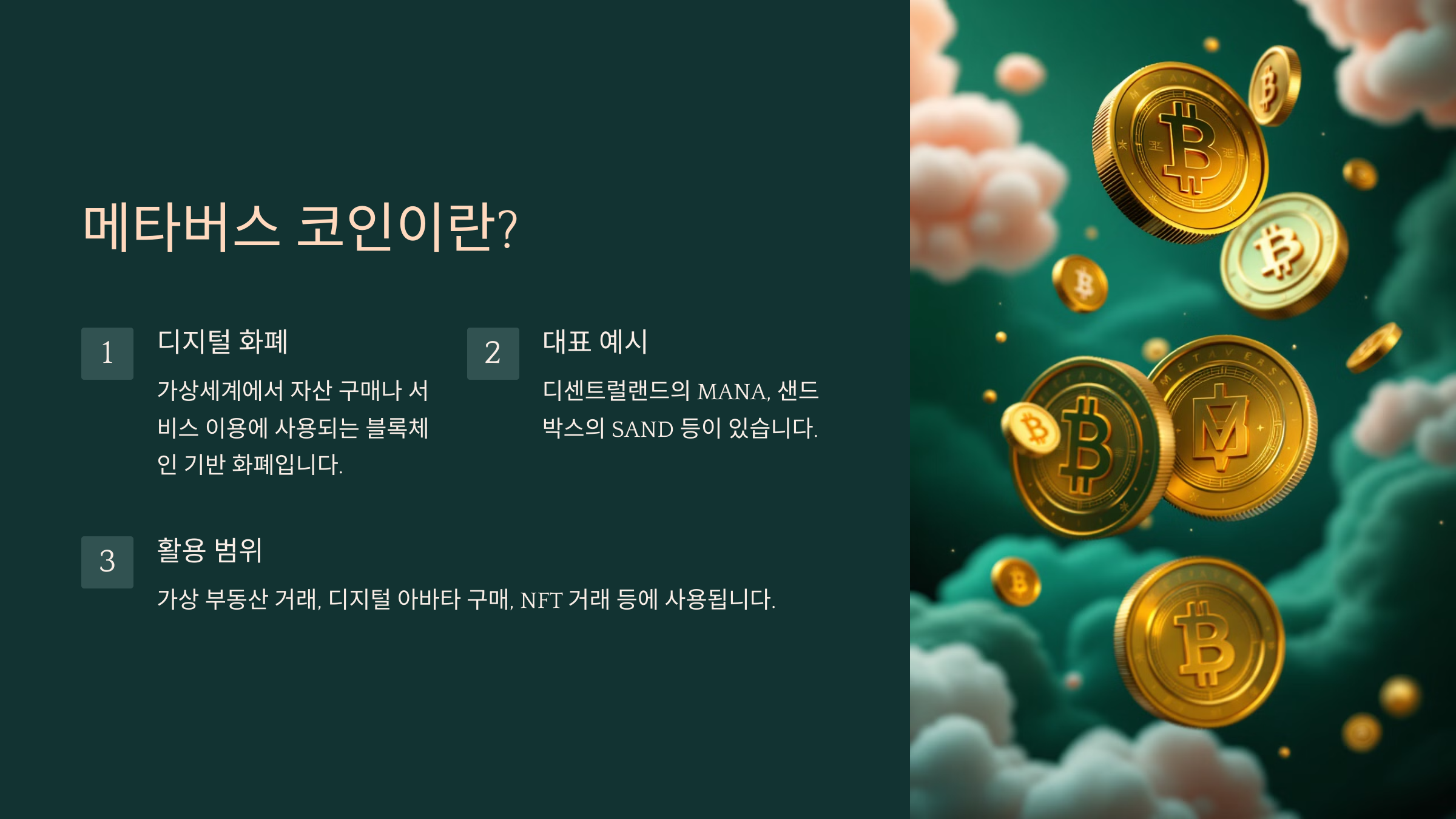 메타버스 코인은 가상세계에서 자산을 구매하거나 서비스를 이용하는 데 사용되는 디지털 화폐예요. 블록체인 기반으로 운영되며, 대표적인 예로 '디센트럴랜드의 MANA'나 '샌드박스의 SAND' 등이 있어요.