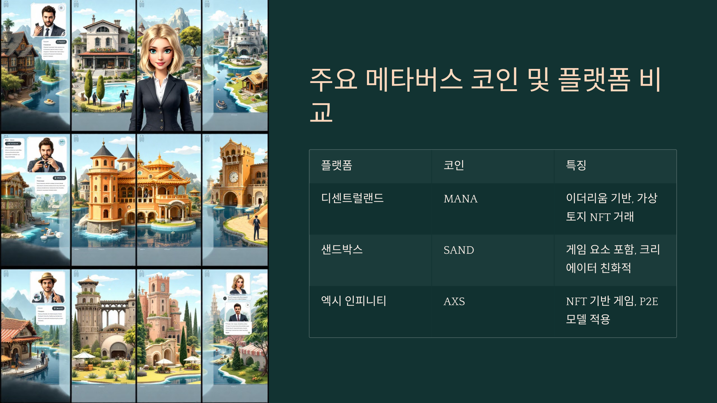 대표적인 메타버스 플랫폼으로는 **디센트럴랜드(Decentraland), 샌드박스(The Sandbox), 엑시 인피니티(Axie Infinity)** 등이 있어요. 이들은 블록체인을 활용해 가상 토지를 NFT로 거래하고, 디지털 경제를 형성하고 있어요.