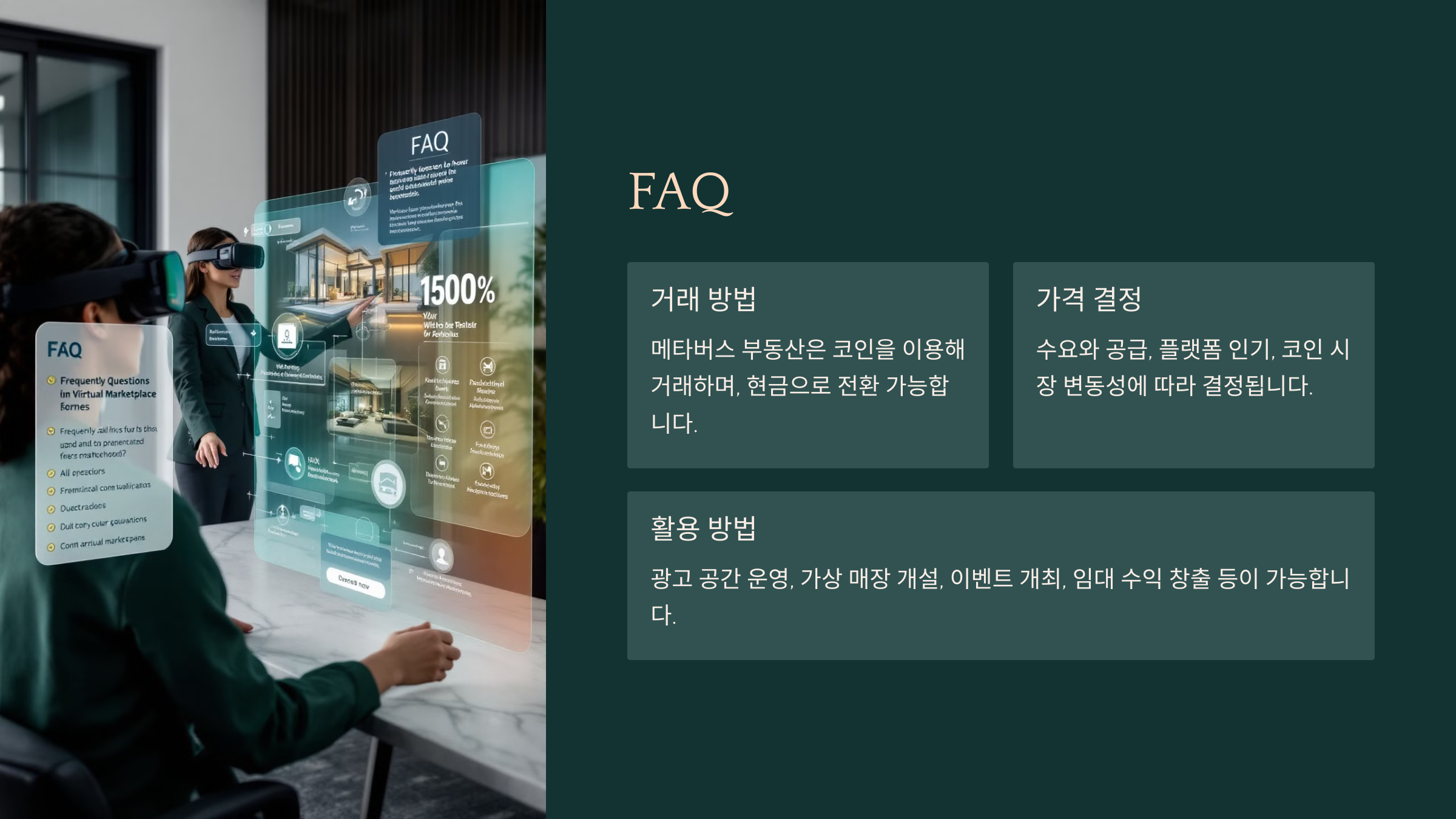 결론적으로, 메타버스 부동산은 **미래 성장 가능성이 크지만, 여전히 많은 리스크가 존재**하는 시장이에요.