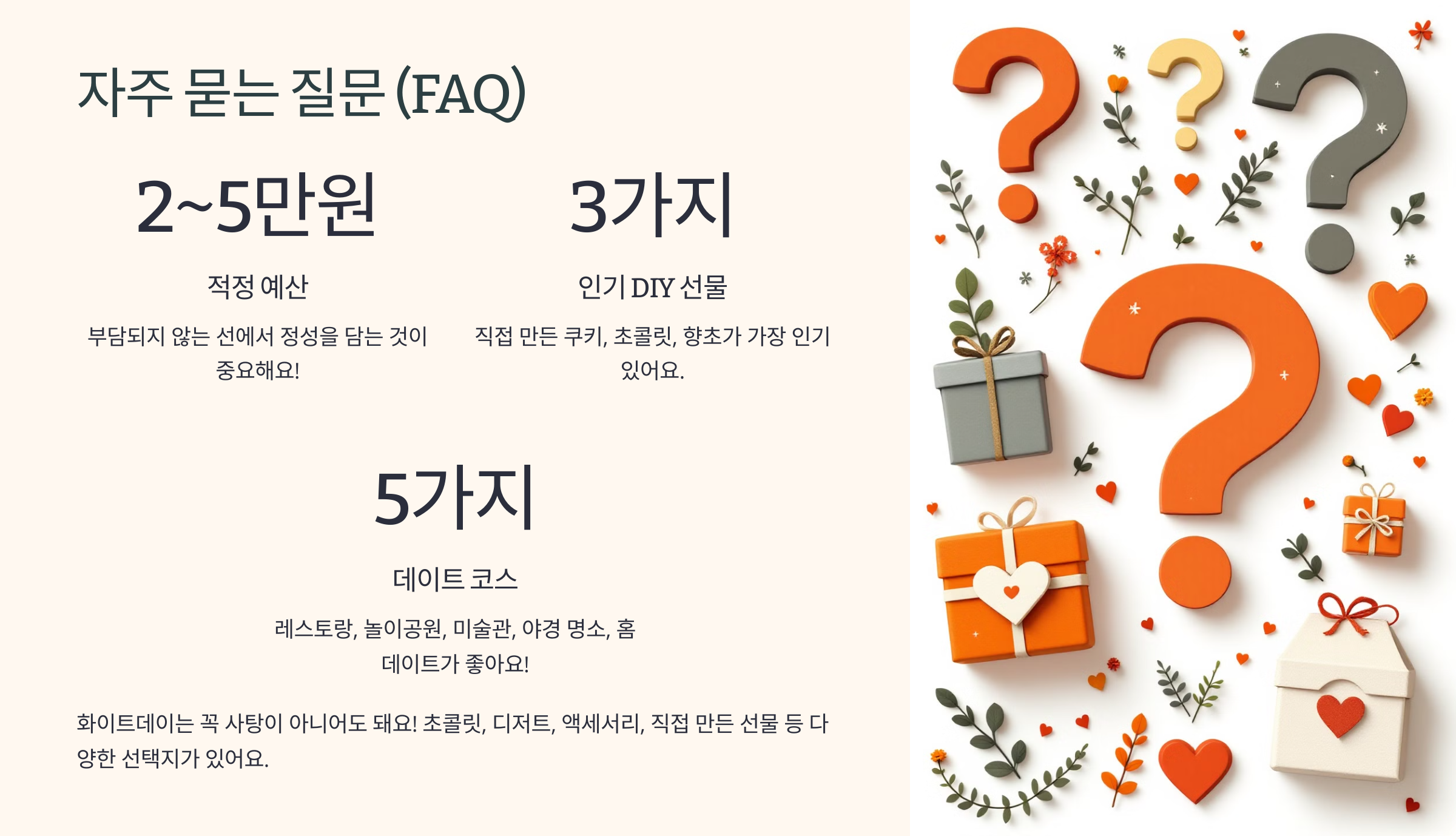 A1. 사탕이 전통적인 화이트데이 선물이지만, 꼭 사탕이 아니어도 돼요! 초콜릿, 디저트, 액세서리, 직접 만든 선물 등 다양한 선택지가 있어요. 🎁