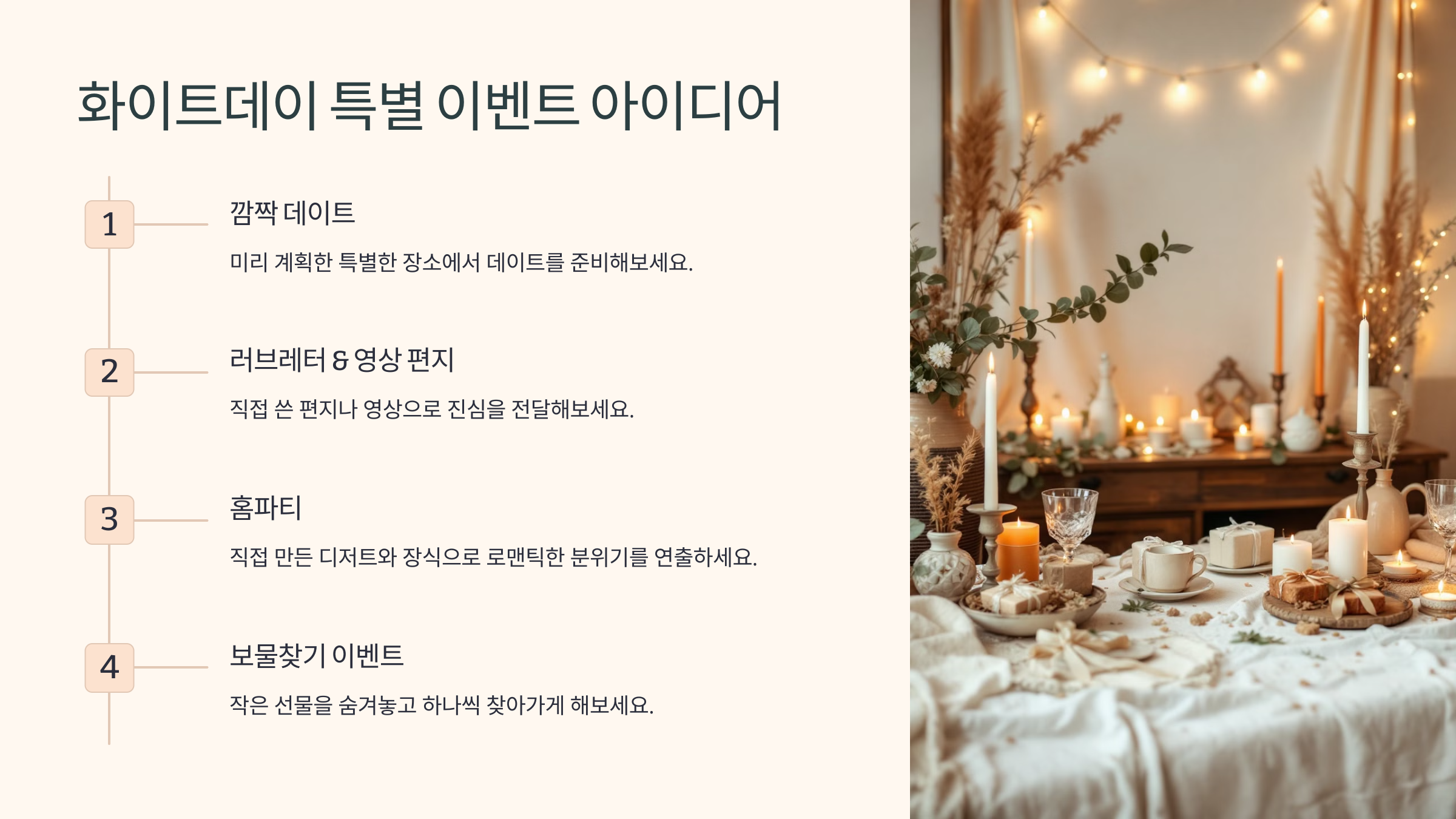 화이트데이를 더 특별하게 만들고 싶다면? 단순히 선물을 주는 것보다 의미 있는 이벤트를 준비하면 감동이 배가될 수 있어요! 💖
