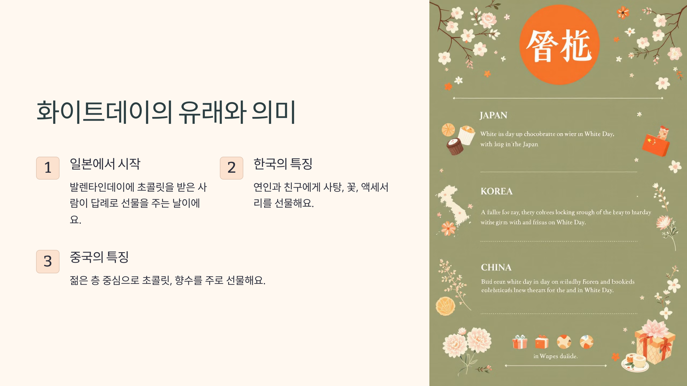 화이트데이는 발렌타인데이(2월 14일)에 초콜릿을 받은 사람이 답례로 선물을 주는 날이에요. 일본에서 시작된 문화로, 한국, 중국 등에서도 기념하는 날이 되었죠! 🇯🇵🎉