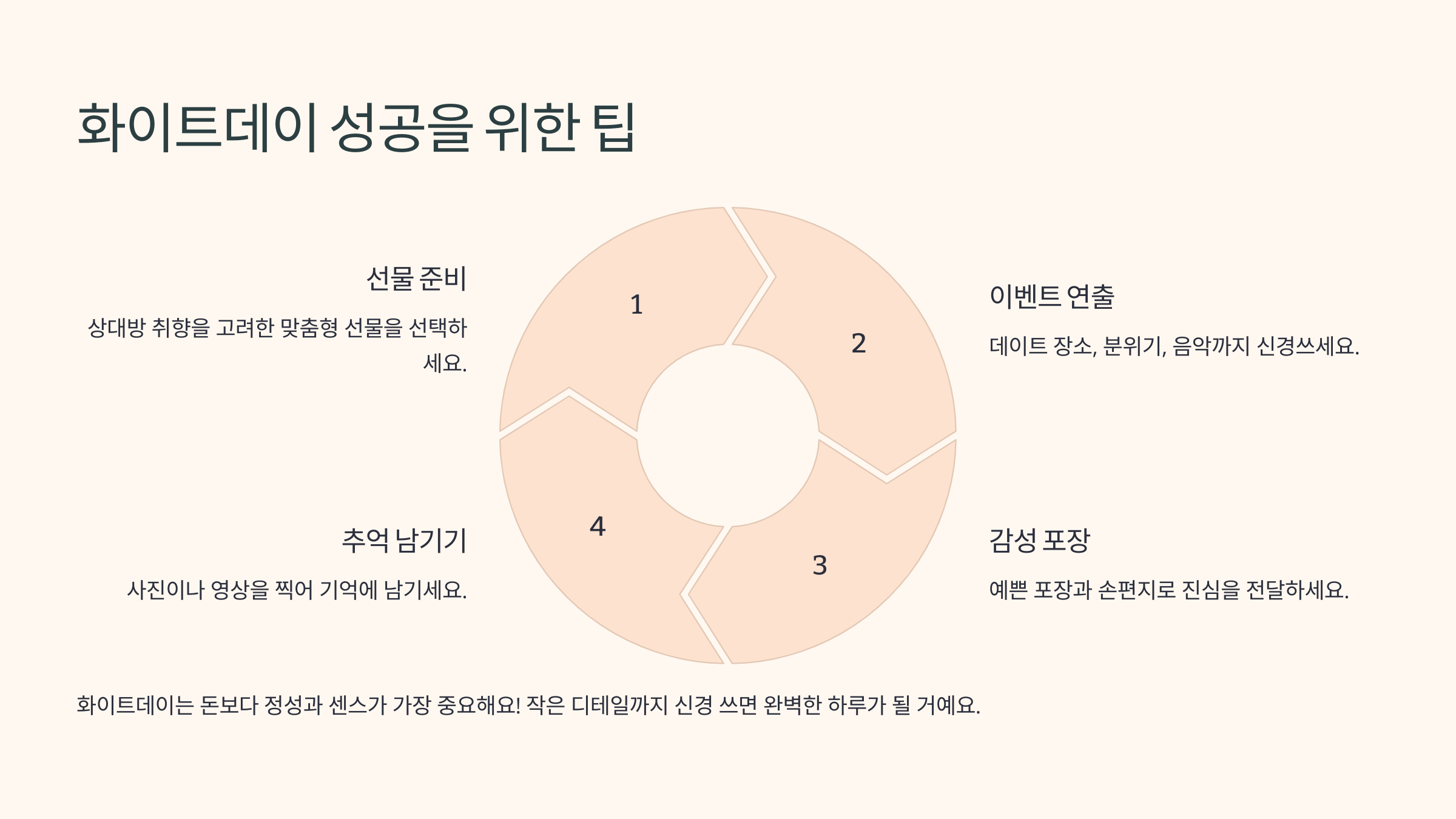 내가 생각했을 때, 화이트데이는 돈보다 정성과 센스가 가장 중요한 것 같아요! 🎀 작은 디테일까지 신경 쓰면 완벽한 하루가 될 거예요. 💕