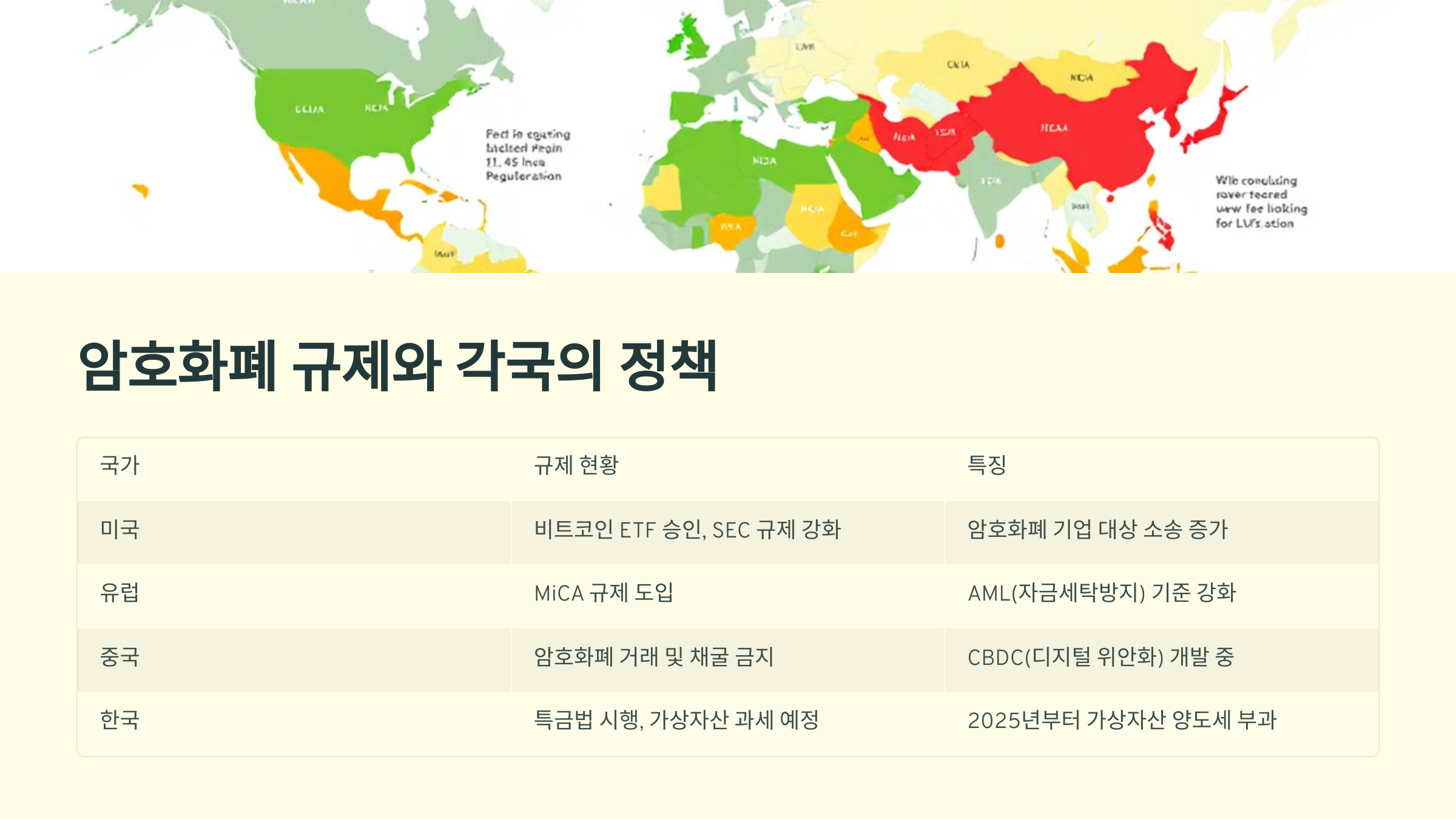 | ⚖️ 규제 명확화 | SEC, EU 등 주요 기관의 법적 가이드라인 확립 | 투자 신뢰도 증가, 거래소 투명성 강화 |