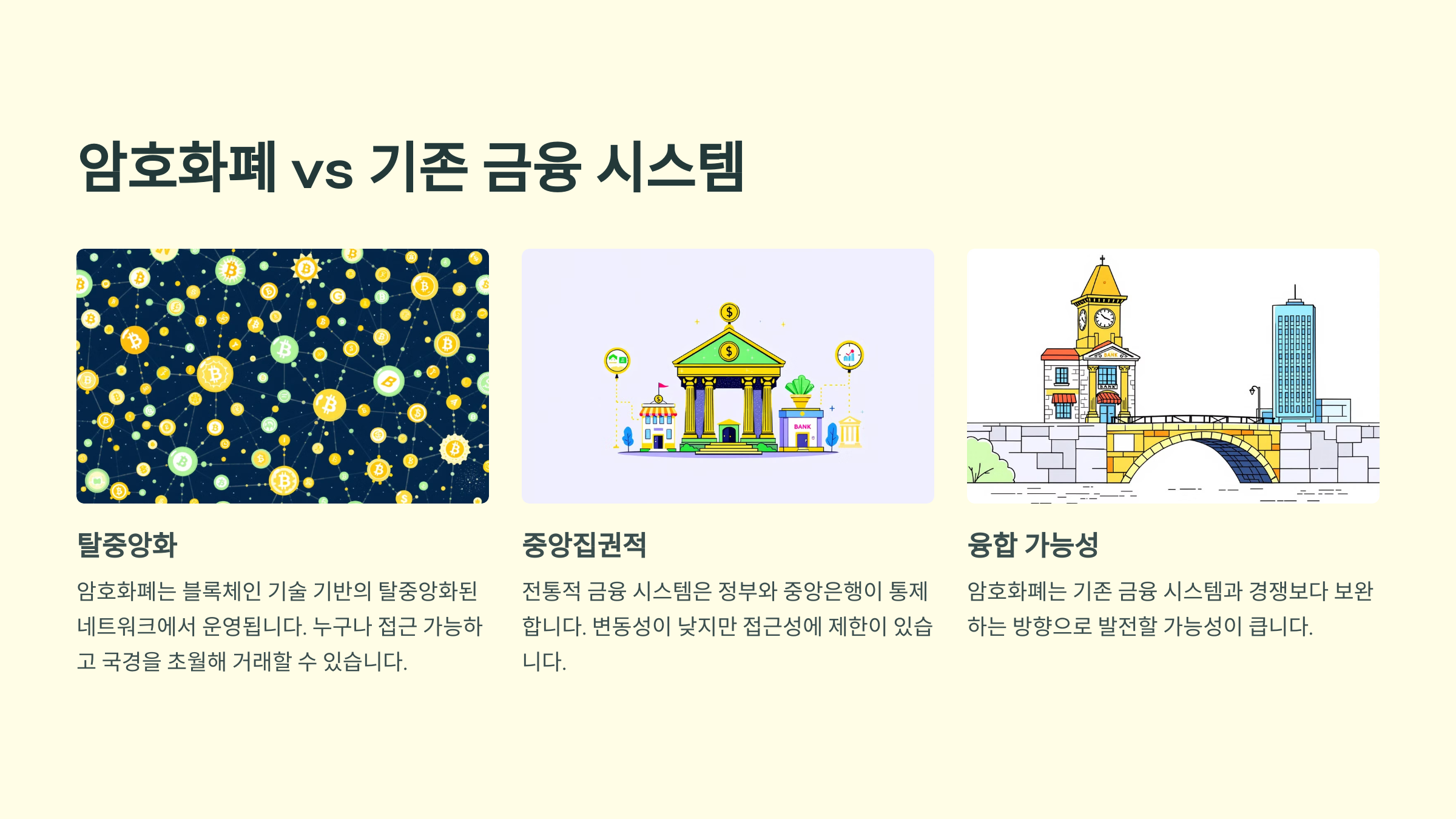 전통적인 금융 시스템은 정부와 중앙은행이 통제하지만, 암호화폐는 누구나 접근할 수 있고, 국경을 초월해 자유롭게 거래할 수 있다는 점에서 차별화돼요. 하지만 기존 금융 시스템보다 변동성이 크고, 규제 리스크가 높다는 단점도 있어요.