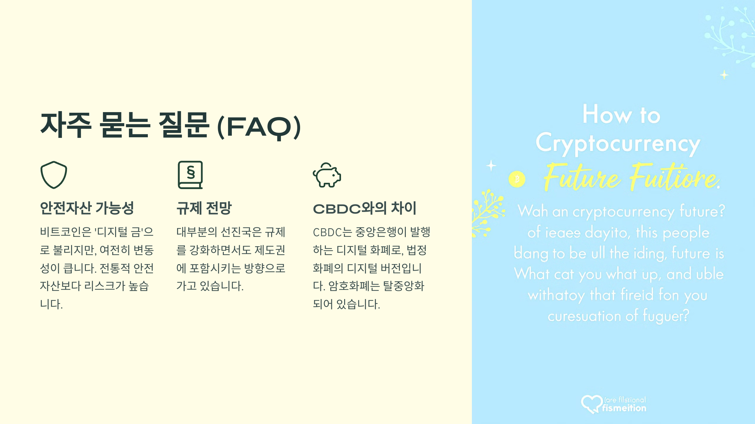 A4. 완전히 대체하기보다는 기존 금융 시스템과 융합될 가능성이 높아요. 특히 중앙은행 디지털화폐(CBDC)가 도입되면 암호화폐와 기존 금융이 공존하는 형태로 발전할 가능성이 커요.