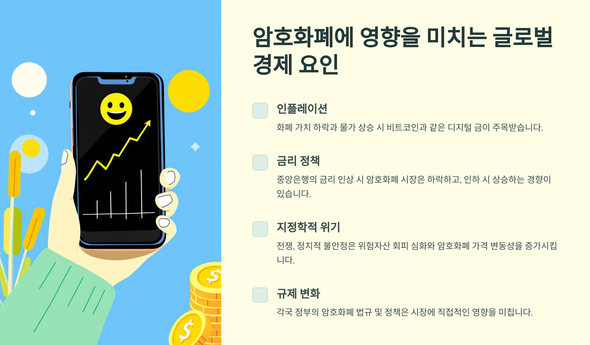 암호화폐 시장은 글로벌 경제 상황에 큰 영향을 받아요. 특히 경제 위기, 금리 변화, 법정화폐 가치, 지정학적 리스크 등 다양한 요소가 암호화폐 가격 변동성에 직결돼요.