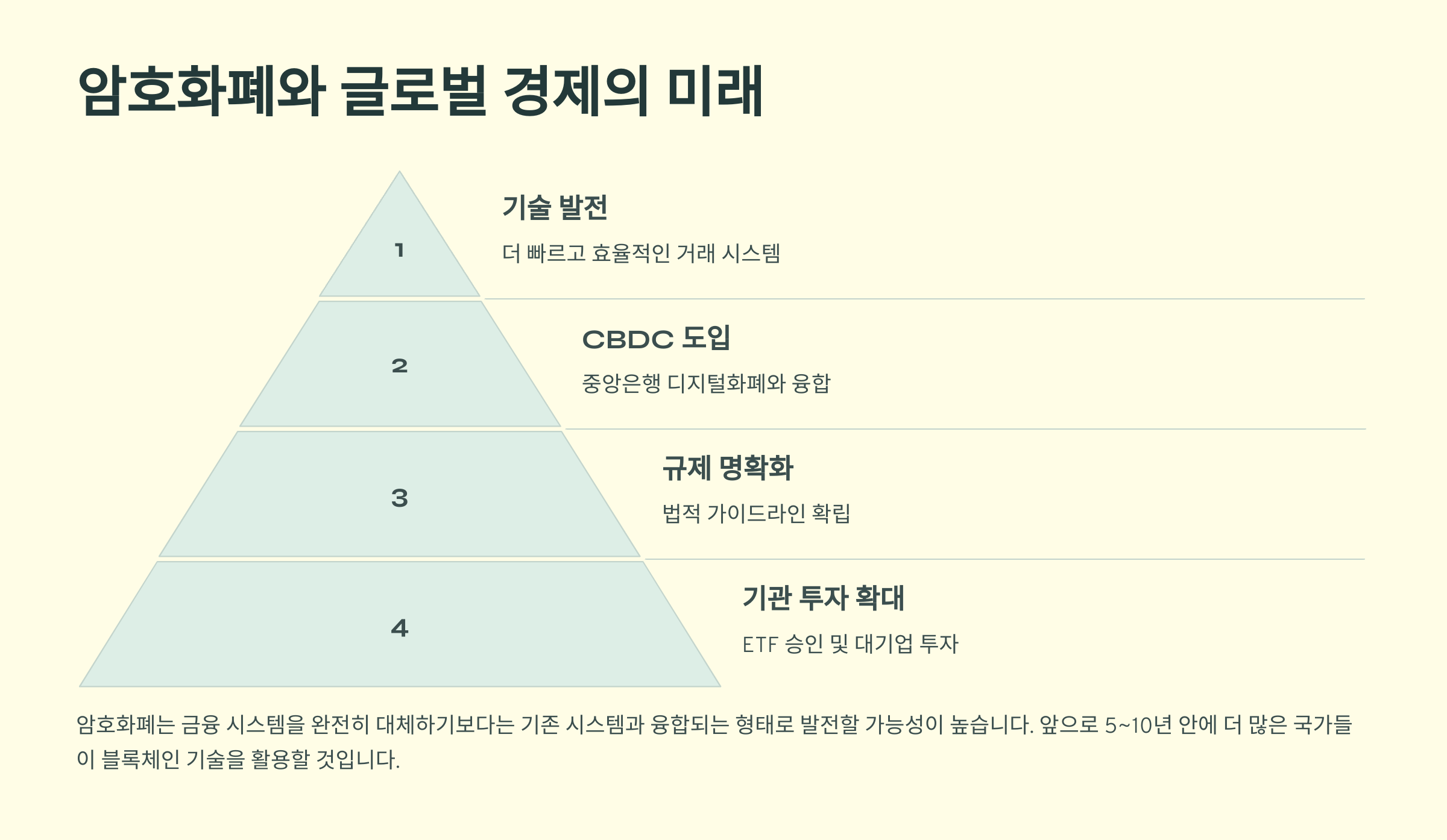 히 중앙은행들이 디지털 화폐(CBDC)를 도입하면 암호화폐와 전통 금융 시스템이 융합되는 형태로 발전할 가능성이 커요. 또한, 블록체인 기술이 더 발전하면 금융 거래의 투명성이 높아지고, 비용 절감 효과도 기대할 수 있어요.