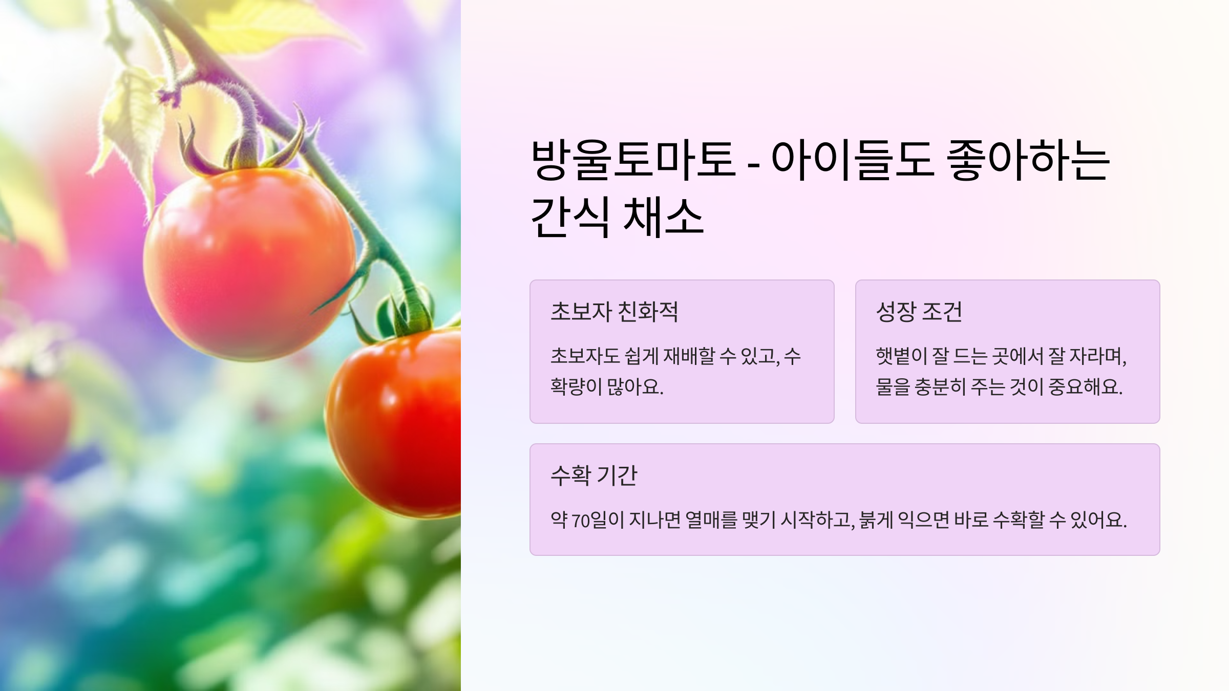 특히 초보자도 쉽게 재배할 수 있고, 수확량이 많아서 아이들과 함께 기르면 더욱 즐거운 경험이 될 수 있어요. 방울토마토는 햇볕이 잘 드는 곳에서 잘 자라며, 물을 충분히 주는 것이 중요해요. 🌞