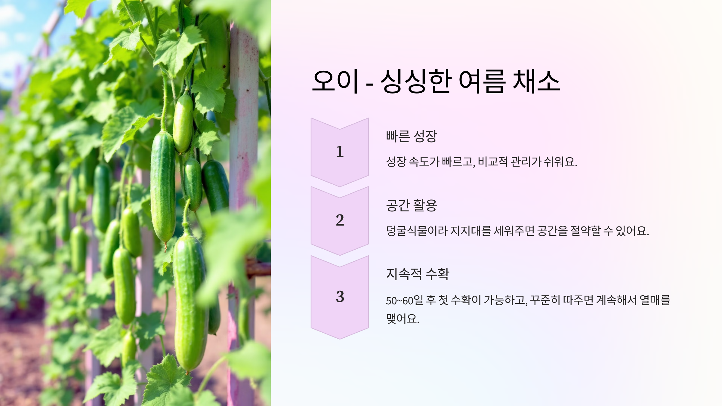 오이는 한 번 심으면 여름 내내 계속 수확할 수 있어서 정말 효율적인 채소예요! 🥒😊