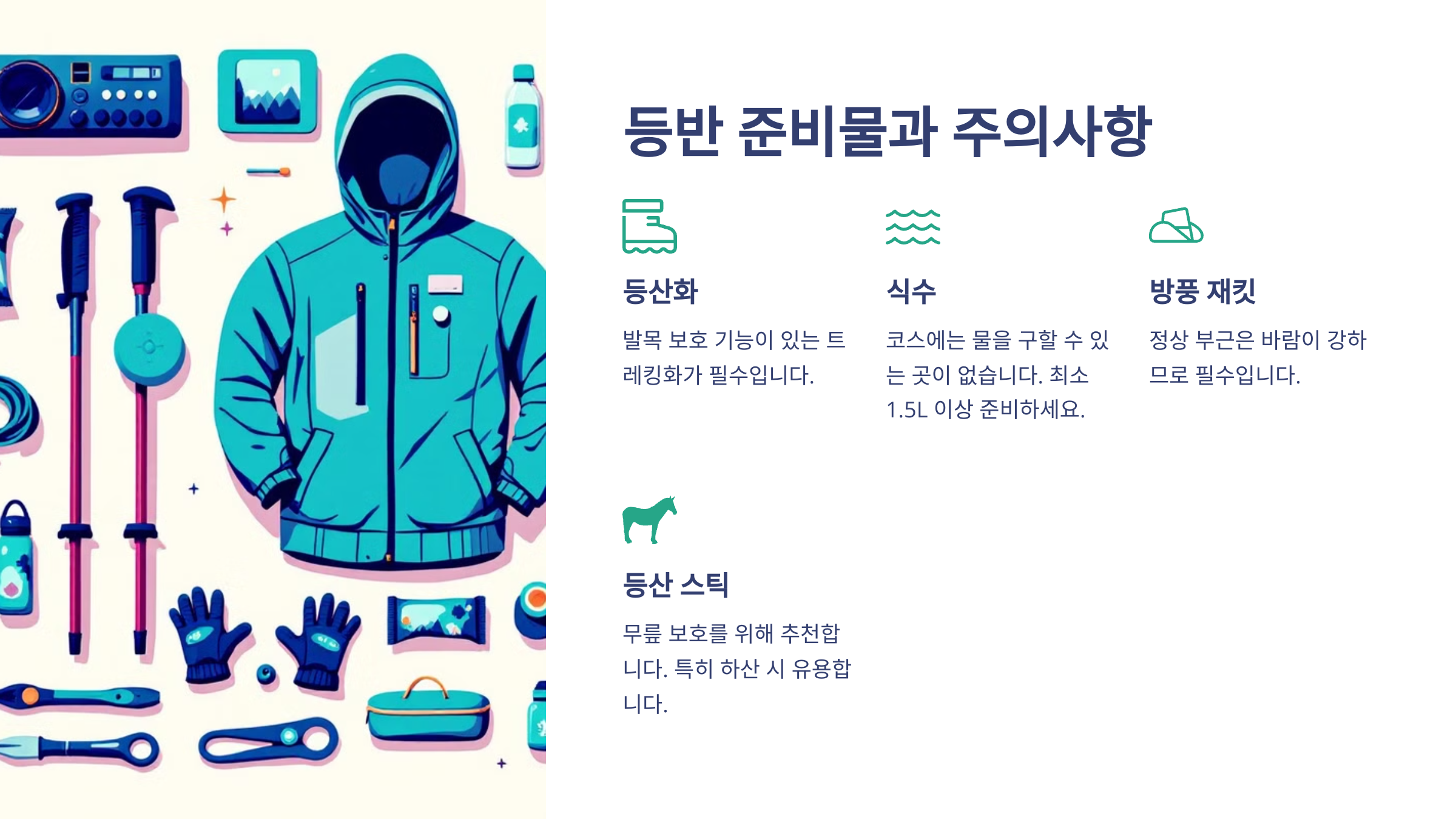 난이도를 고려하면 초보자도 도전할 수 있지만, 6시간 이상 걷는 것이 부담스럽다면 중간에서 하산하는 것도 방법이에요. 그리고 하산할 때는 발목과 무릎 보호를 위해 스틱을 사용하는 게 좋아요. 🥾
