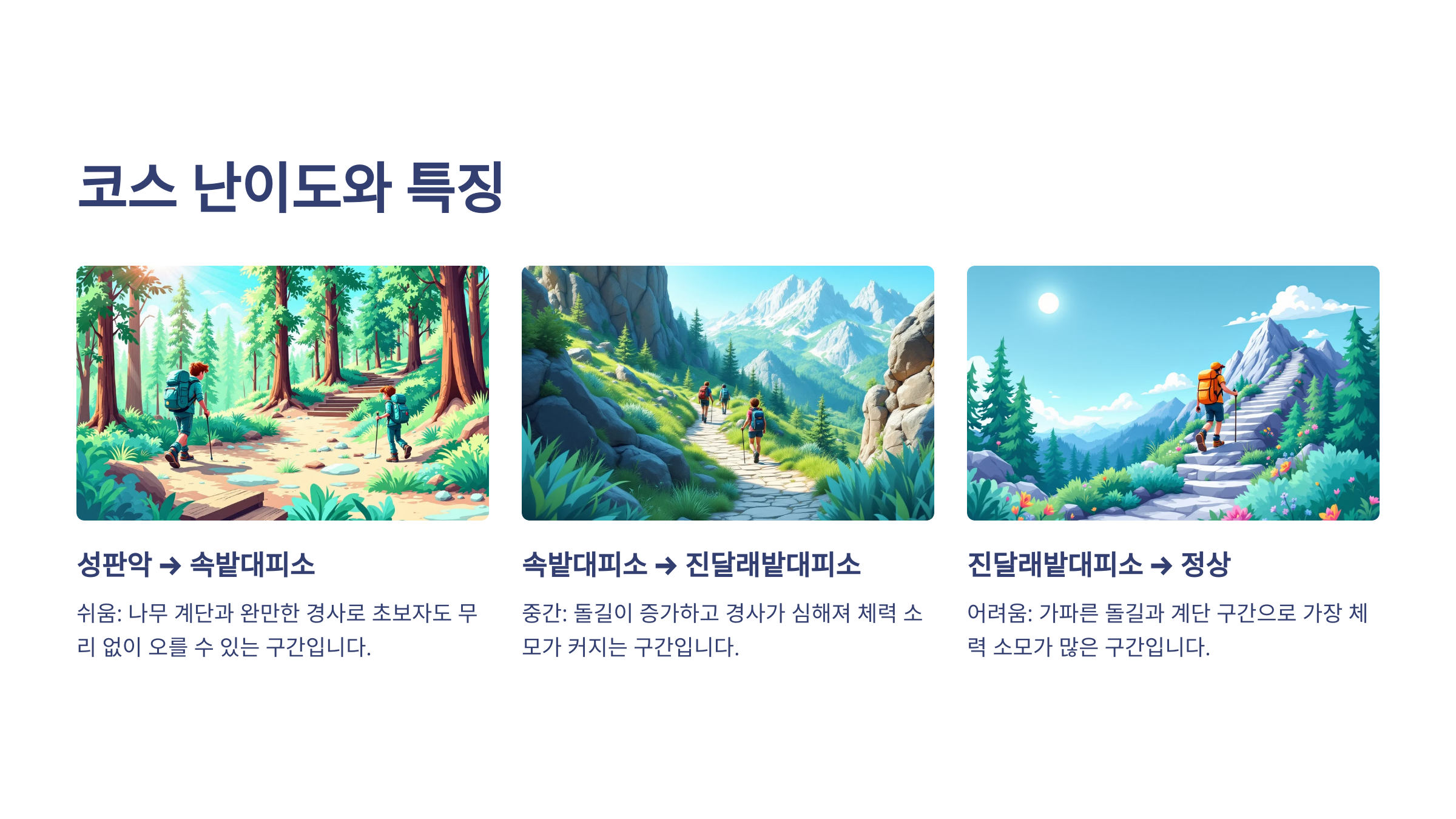 특히 겨울철에는 눈이 쌓여 등산 난이도가 높아지므로 등산 스틱과 아이젠을 필수로 준비해야 해요. 반대로 여름에는 더운 날씨와 높은 습도로 인해 체력 소모가 커질 수 있어요.