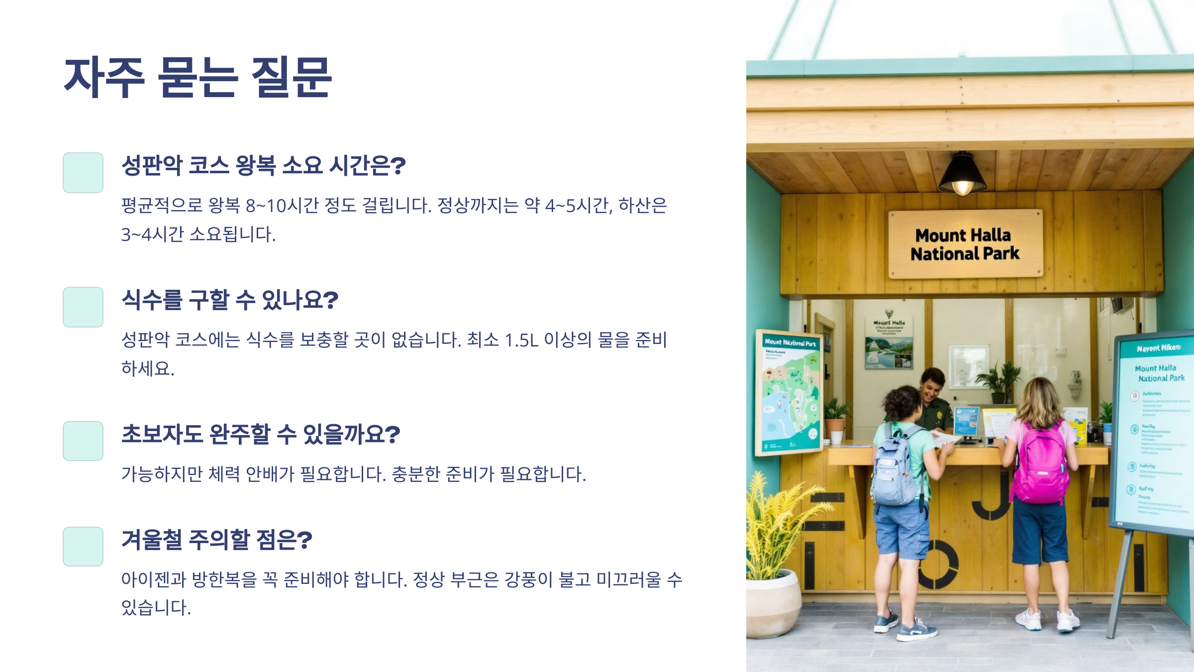 또한, 성판악 코스는 새벽부터 올라야 정상까지 다녀올 수 있어요. 입산 가능 시간(동절기: 6시~12시, 하절기: 5시~12시)을 확인하고, 오전 일찍 출발하는 것이 좋아요.