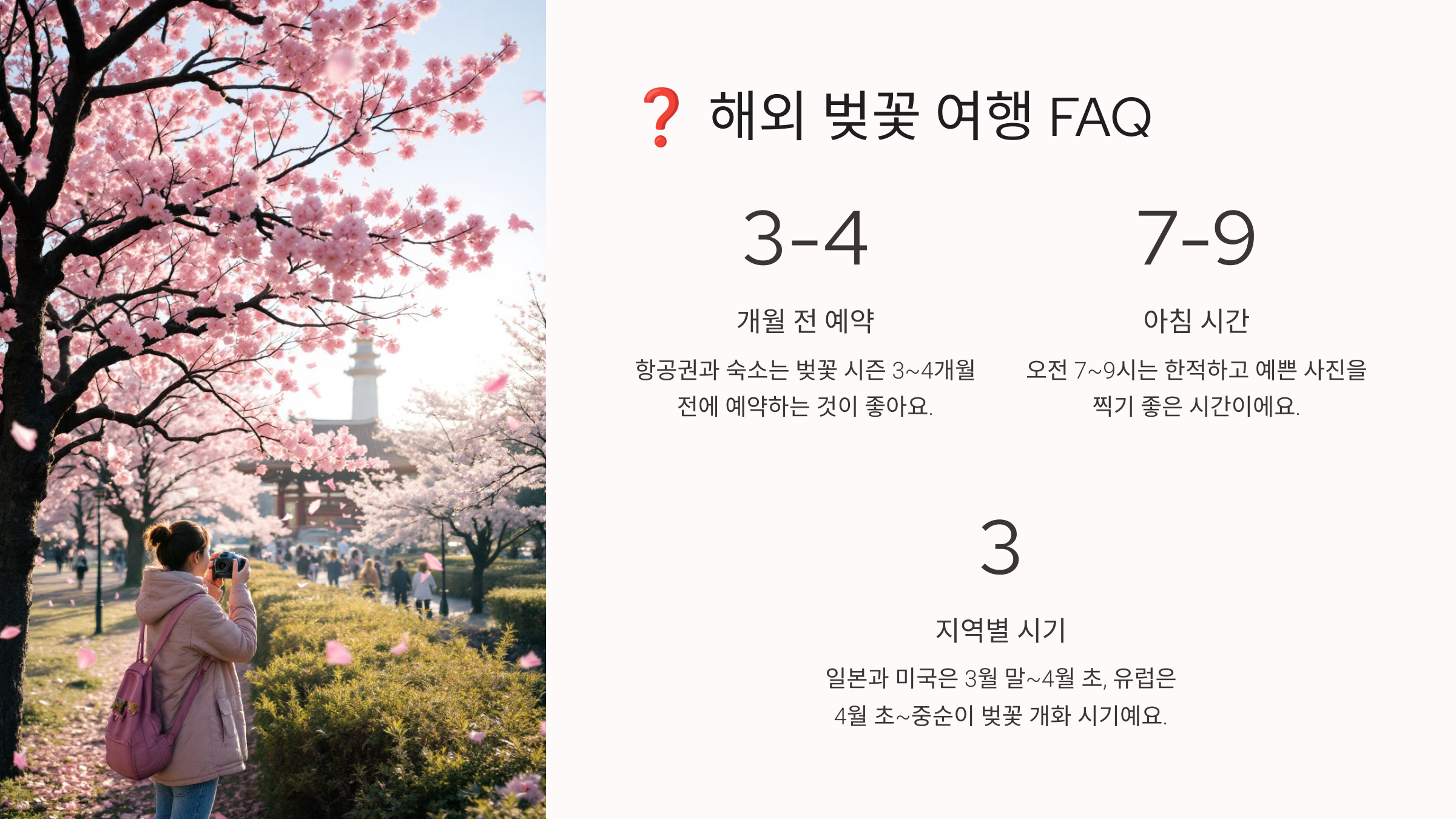 마지막으로, 사람들이 가장 궁금해하는 해외 벚꽃 여행 관련 FAQ를 살펴볼까요? ⬇️