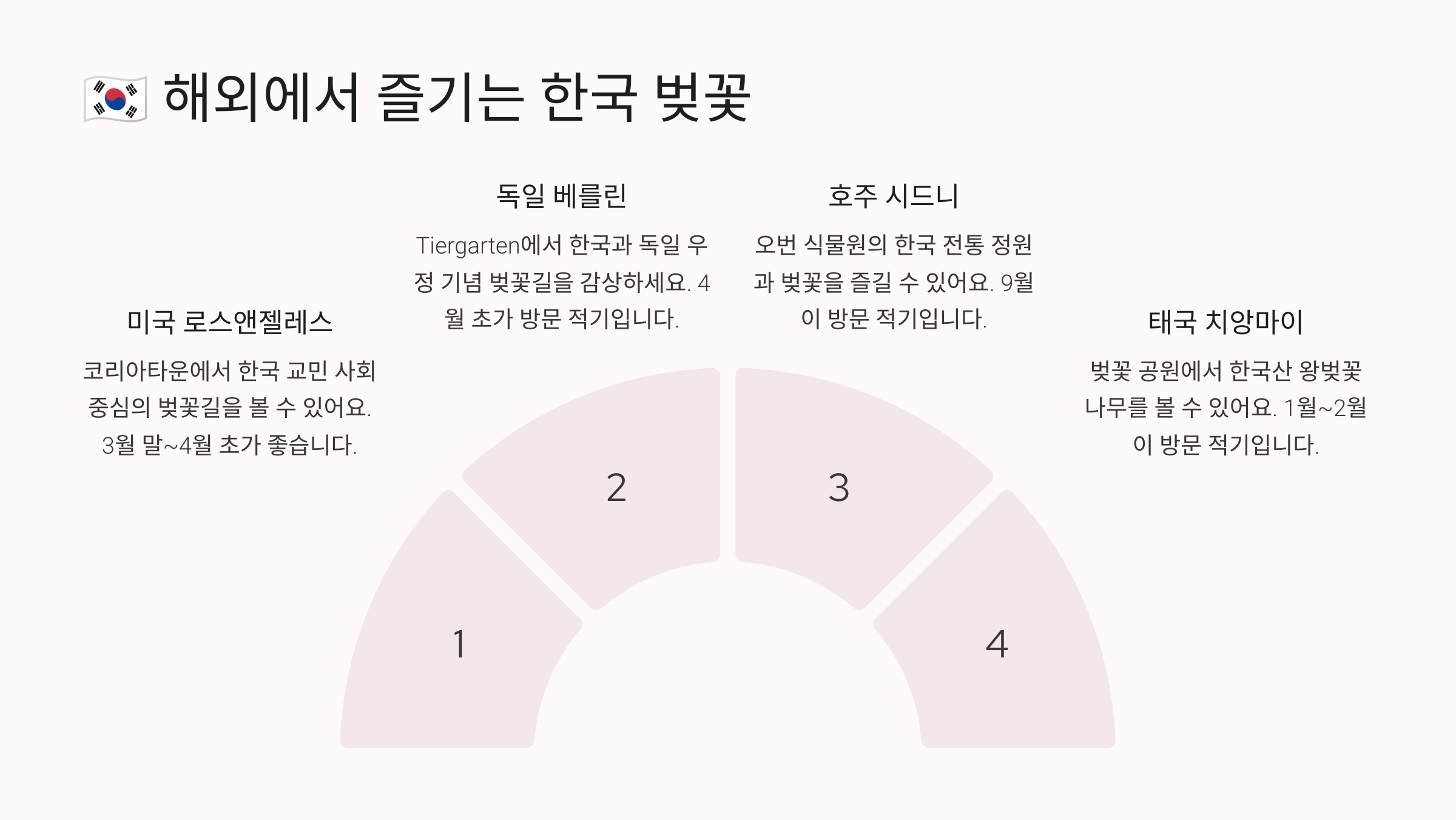 그럼, 해외에서 한국 벚꽃을 감상할 수 있는 대표적인 명소들을 소개해 드릴게요! ✨