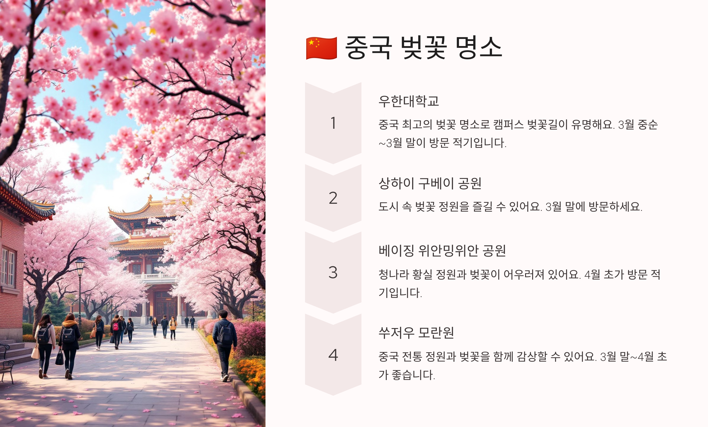중국의 벚꽃 명소들은 고풍스러운 건축물과 어우러져 더욱 특별한 느낌을 줘요. 특히 우한대학교는 벚꽃이 만개하면 인생 사진을 남기기 좋은 명소랍니다! 📸