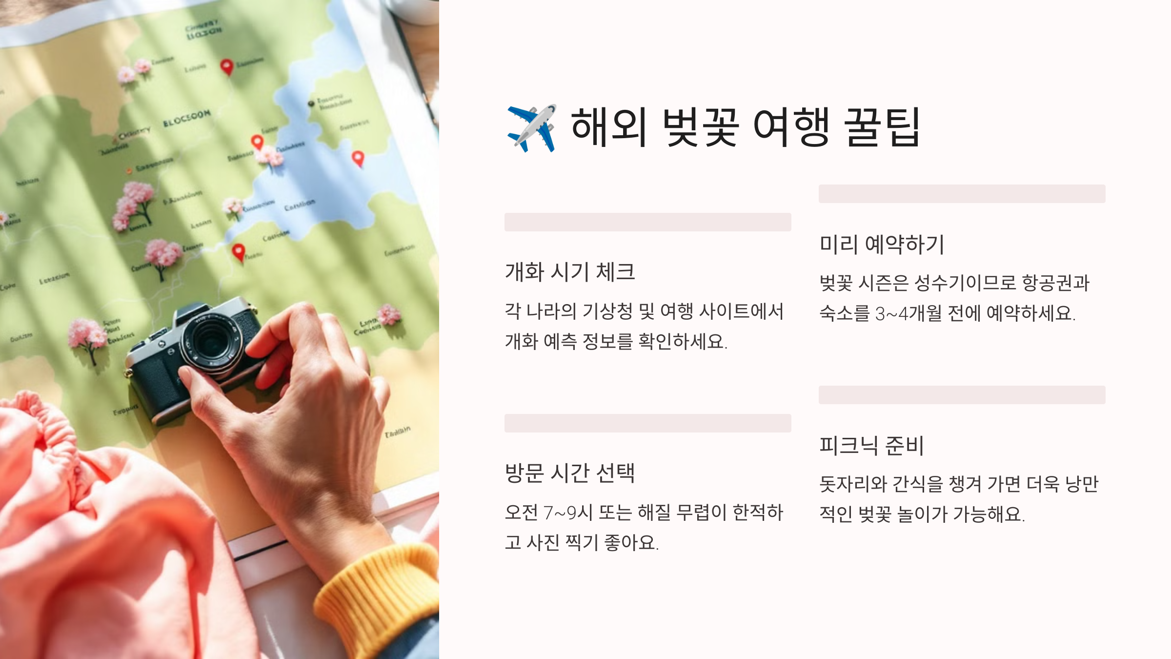 그럼, 해외 벚꽃 여행을 더욱 스마트하게 즐길 수 있는 필수 꿀팁을 정리해볼게요! 💡