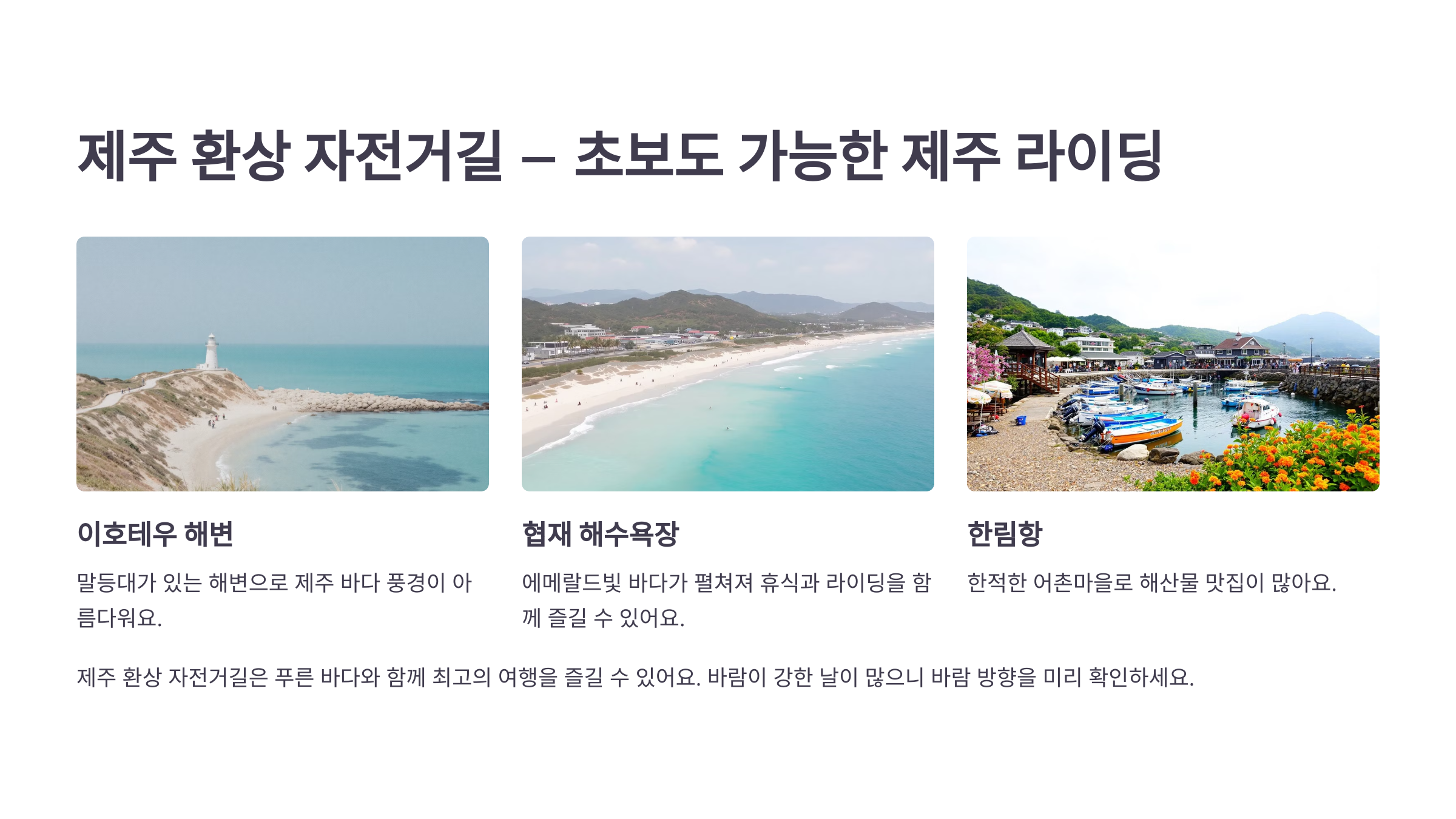 🚲 이용 팁: 제주도는 바람이 강한 날이 많으니, 바람 방향을 미리 확인하고 코스를 정하는 것이 좋아요. 또한, 자전거 대여소가 많아 여행자도 쉽게 이용할 수 있어요.