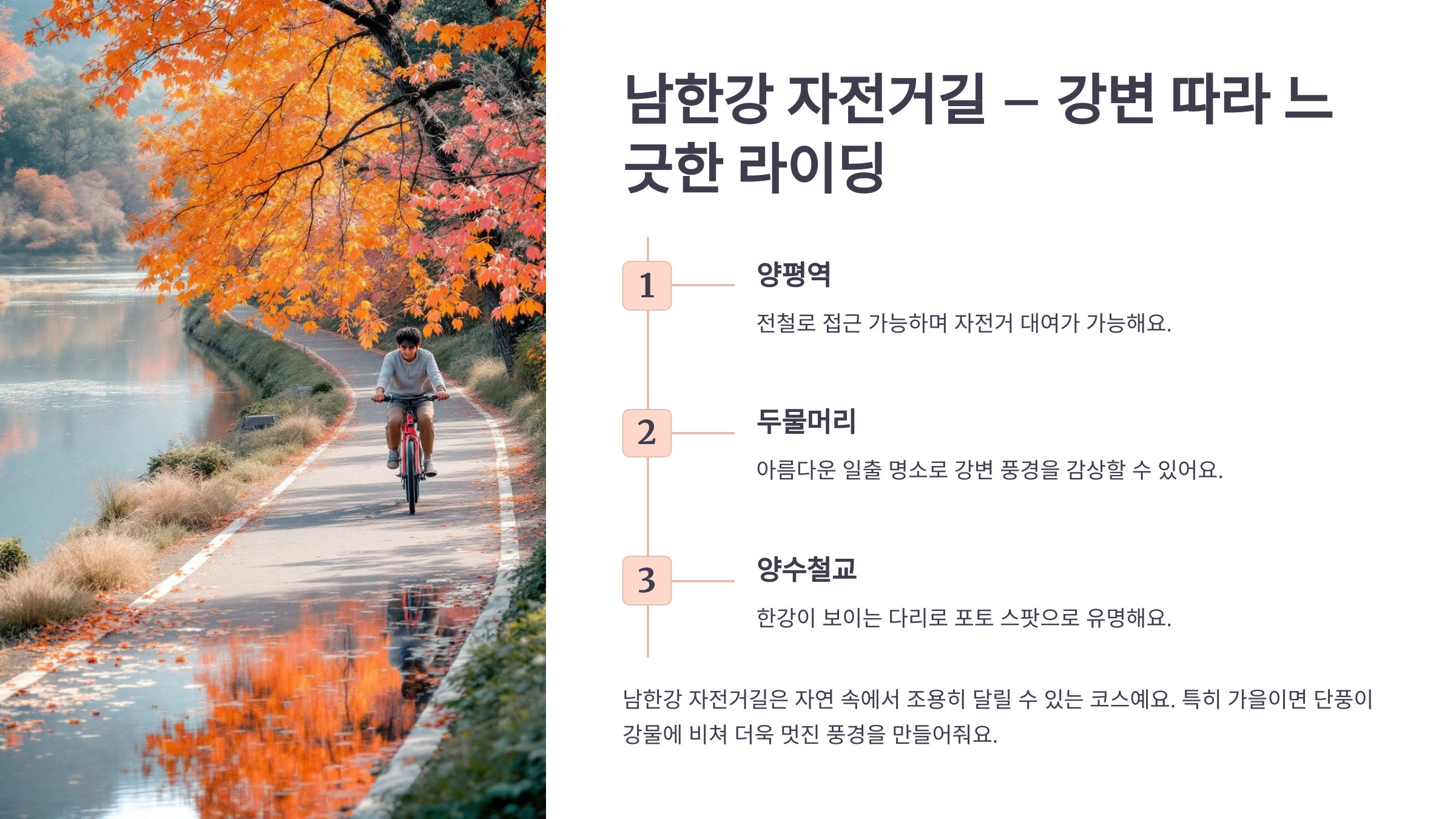 🚴♂️ 코스 특징: 강을 따라가는 길이라 오르막이 거의 없고, 자연경관이 아름다워요. 특히 가을이면 단풍이 강물에 비쳐 더욱 멋진 풍경을 만들어줘요.