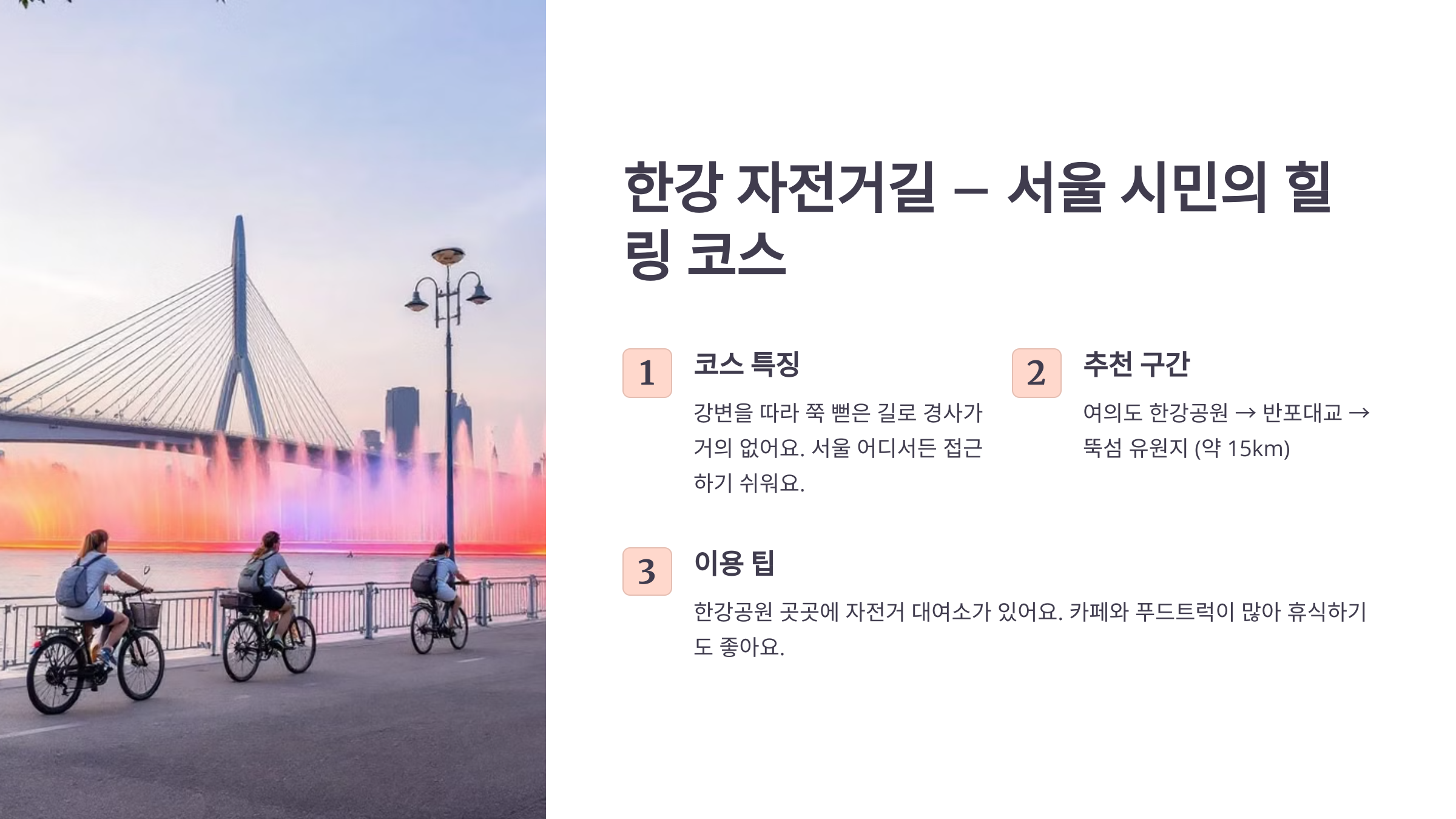 🚴♂️ 코스 특징: 강변을 따라 쭉 뻗은 길로 경사가 거의 없어요. 서울 어디서든 접근하기 쉬우며, 중간중간 공원과 쉼터가 많아 여유로운 라이딩이 가능해요.