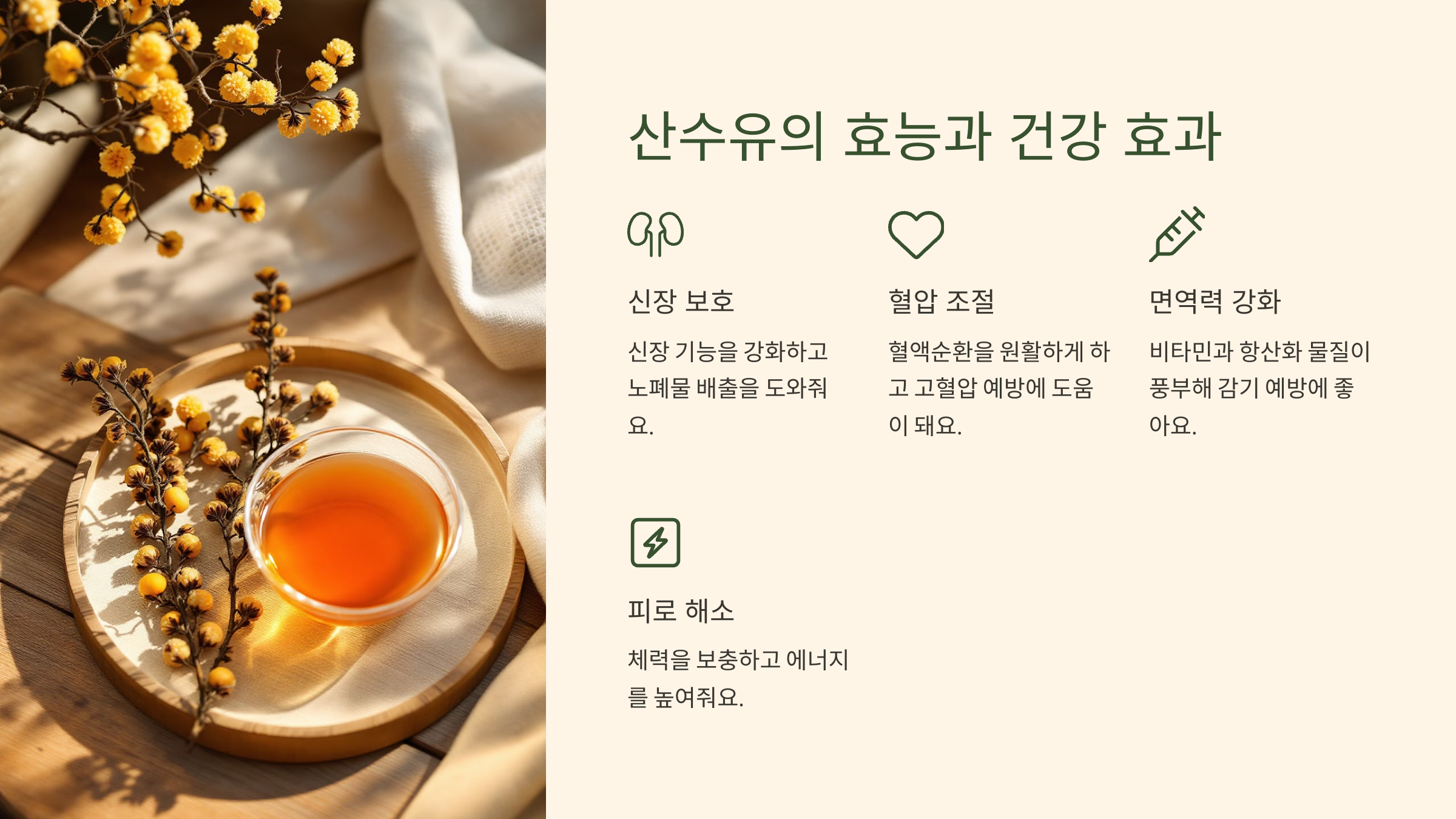 산수유는 단순히 건강 보조제뿐만 아니라, 차로 끓여 마시거나 다양한 음식에 활용할 수도 있어. 꾸준히 섭취하면 몸을 따뜻하게 해주고, 감기 예방에도 좋아. 요즘 같은 환절기에 산수유차 한 잔 마시면 건강 관리에 딱이야.