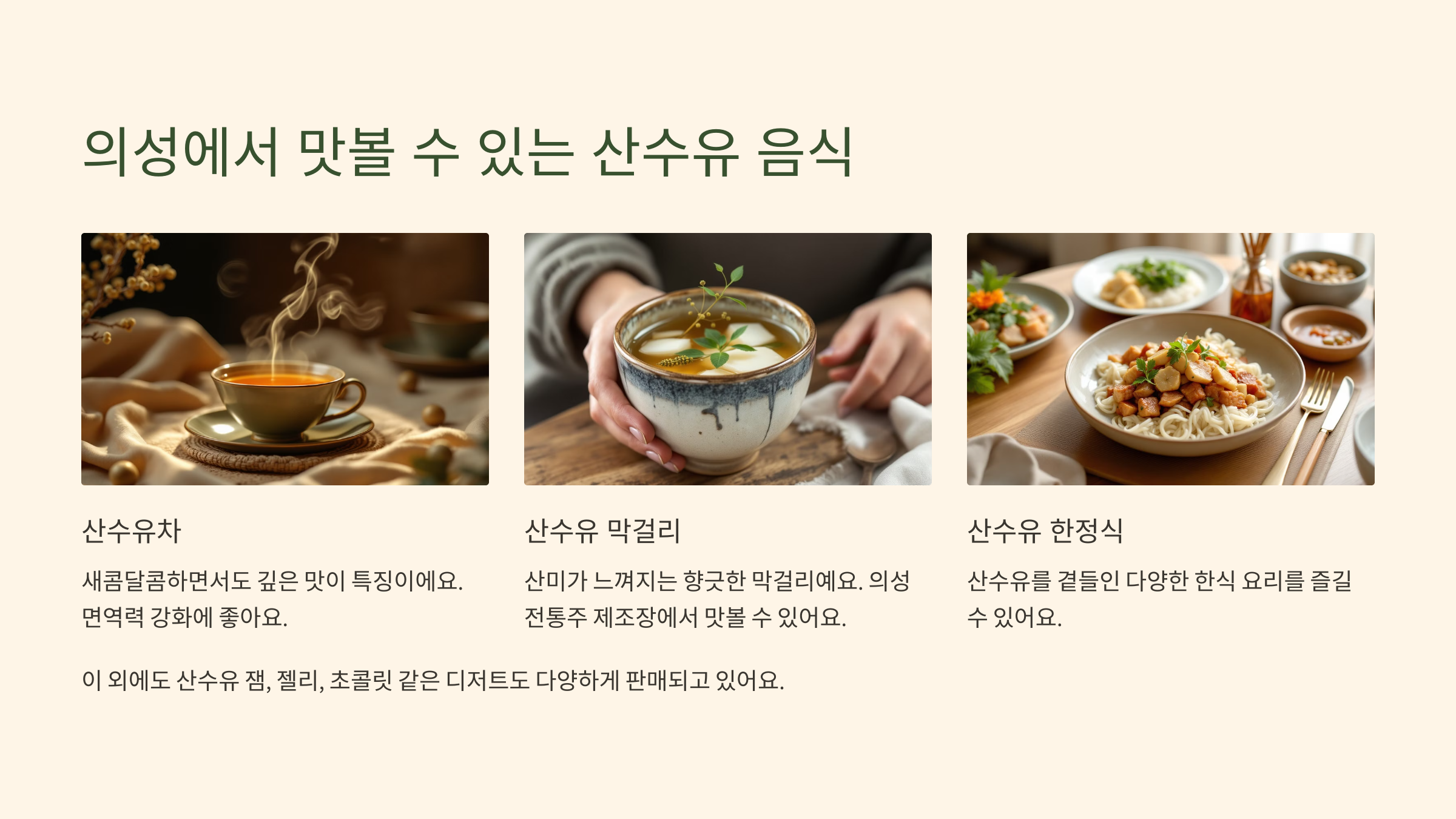 산수유차는 가장 대표적인 음식이야. 말린 산수유를 끓여 만든 이 차는 노폐물 배출을 돕고 몸을 따뜻하게 해줘서 특히 겨울철에 인기가 많아. 의성의 전통 찻집에서는 직접 달인 산수유차를 맛볼 수 있어.