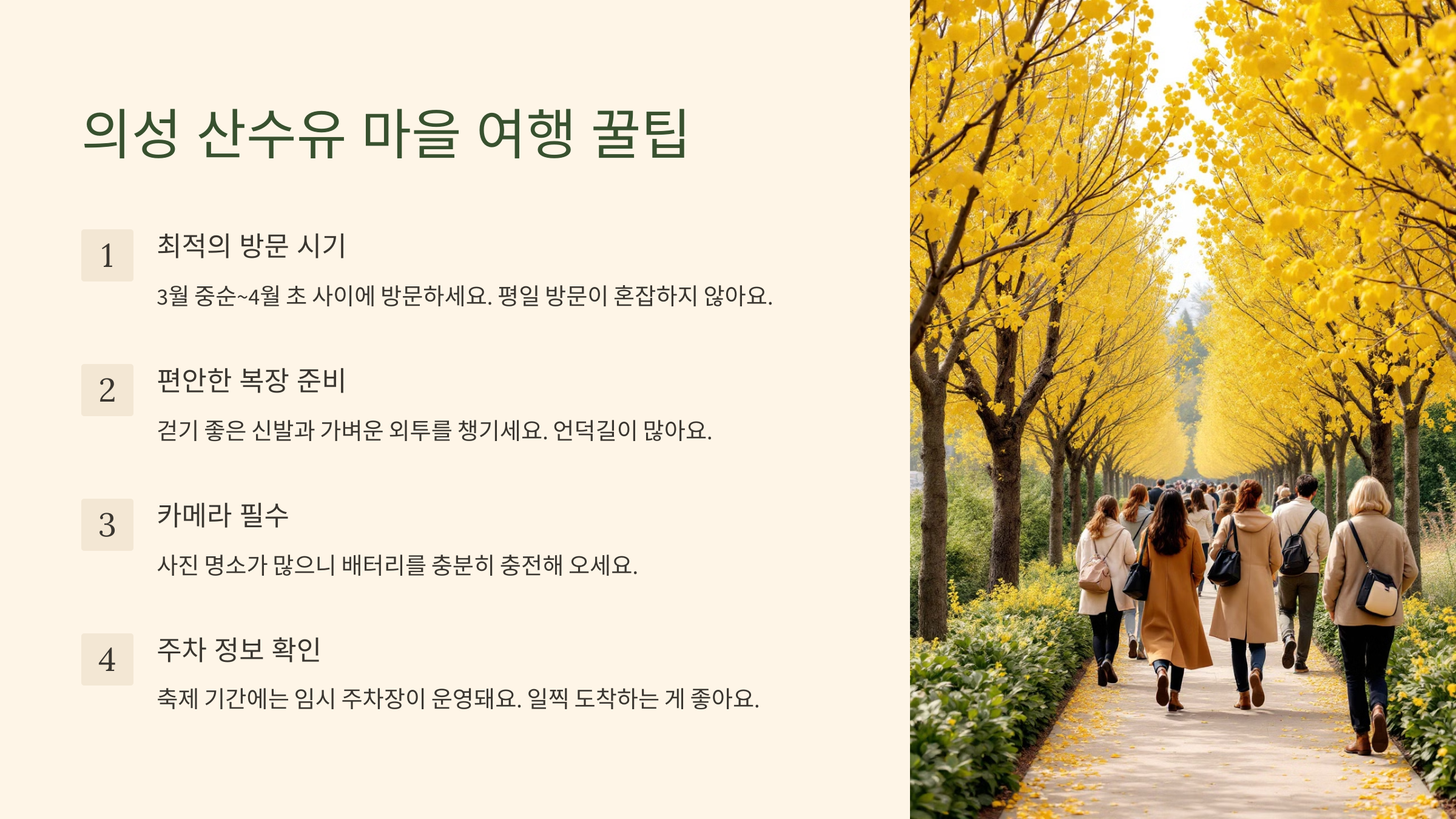 의성 산수유 마을을 제대로 즐기려면 몇 가지 여행 팁을 알고 가는 게 좋아. 특히 봄철에는 관광객이 많아서 미리 준비하면 더 편하게 여행할 수 있어.