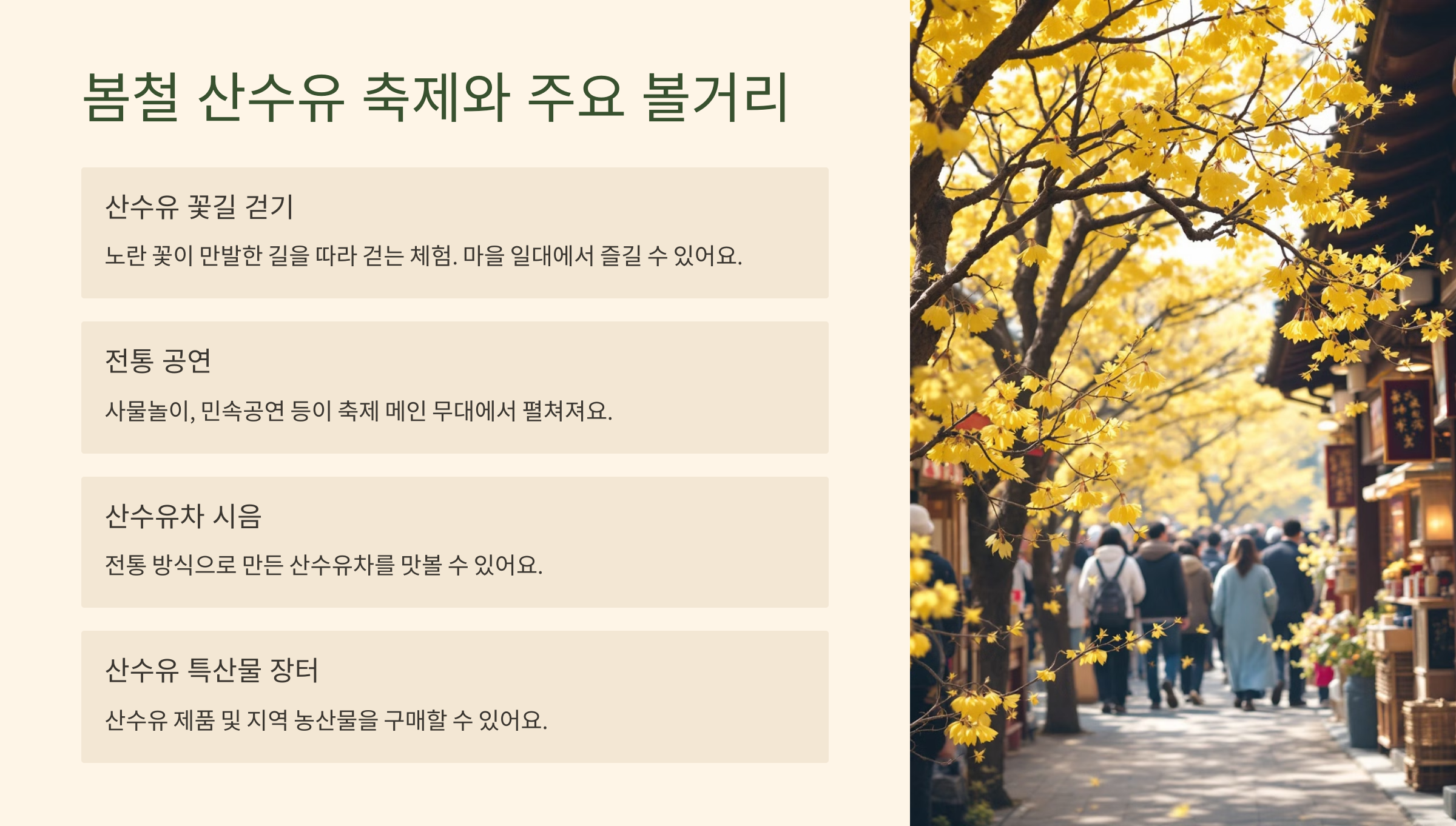 산수유 축제에서는 전통 공연, 농특산물 장터, 체험 프로그램 등 다양한 행사가 마련돼 있어. 특히 한복을 입고 산수유꽃길을 걸어보는 체험이나 산수유차 시음 같은 이벤트가 인기야. 이외에도 지역 주민들이 직접 만든 산수유 잼, 한방 제품 등을 구매할 수 있어.