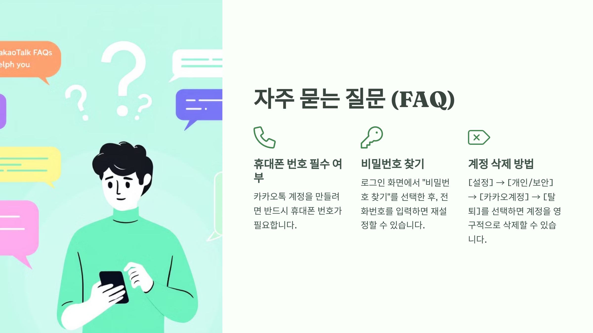 이제 카카오톡 계정에 대한 모든 내용을 마무리할 차례예요! 🎉 사람들이 가장 궁금해하는 질문들을 FAQ에서 확인해볼까요? 🤔👇