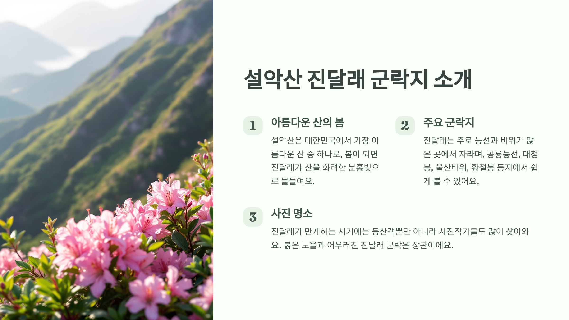 설악산은 대한민국에서 가장 아름다운 산 중 하나로, 사계절 내내 다른 매력을 뽐내요. 특히 봄이 되면 진달래가 군락을 이루며 산을 화려한 분홍빛으로 물들이죠. 🌸
