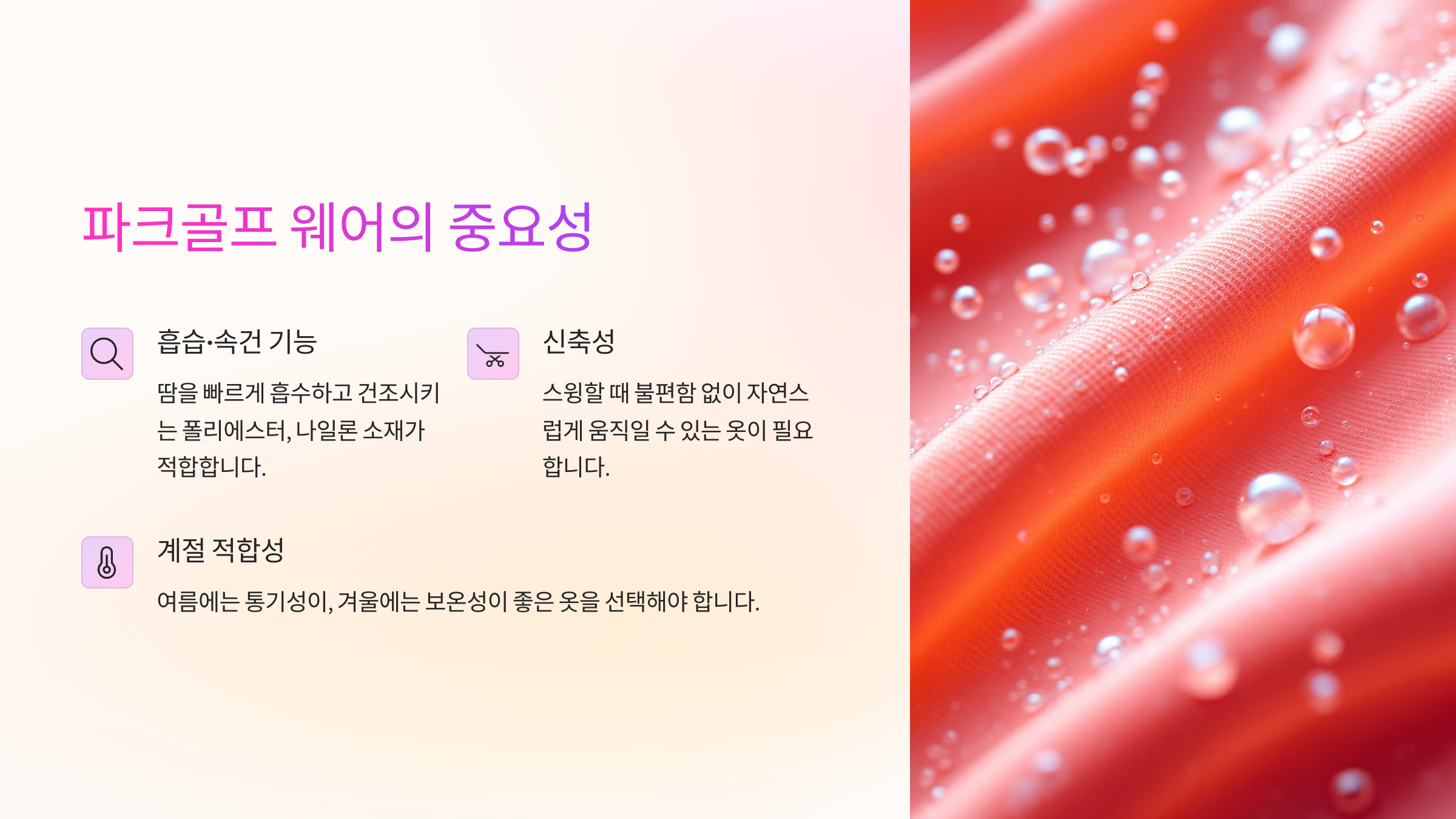 파크골프는 계절과 날씨에 따라 적절한 복장을 갖추는 것이 중요해요 여름에는 땀을 빠르게 흡수하는 시원한 옷을, 겨울에는 보온성이 좋은 옷을 선택해야 해요