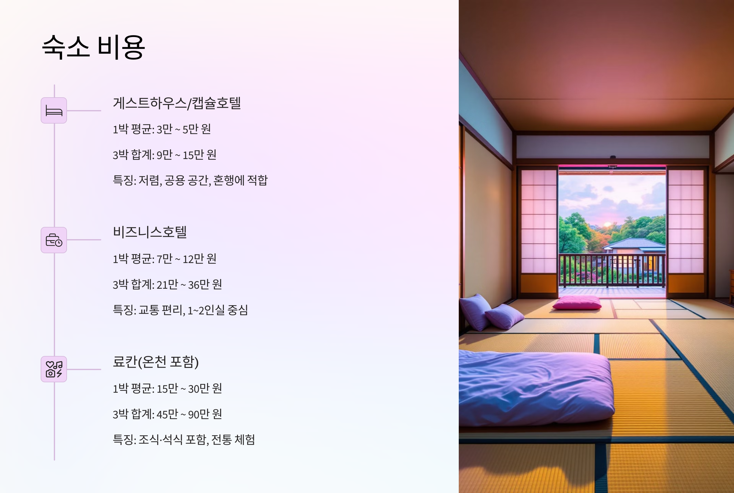 숙소는 여행 스타일에 따라 예산 차이가 가장 크게 나는 항목 중 하나예요. 일본은 숙박 옵션이 매우 다양해서 게스트하우스, 캡슐호텔, 비즈니스호텔, 료칸 등 본인 취향과 예산에 맞게 선택할 수 있어요. 3박 기준으로 계산하며 1인실 기준 평균 가격을 정리했어요.