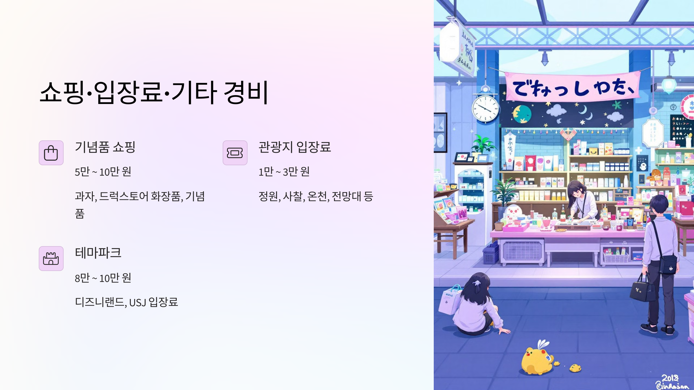 | 테마파크 | 8만 ~ 10만 원 | 디즈니랜드, USJ 입장료 |