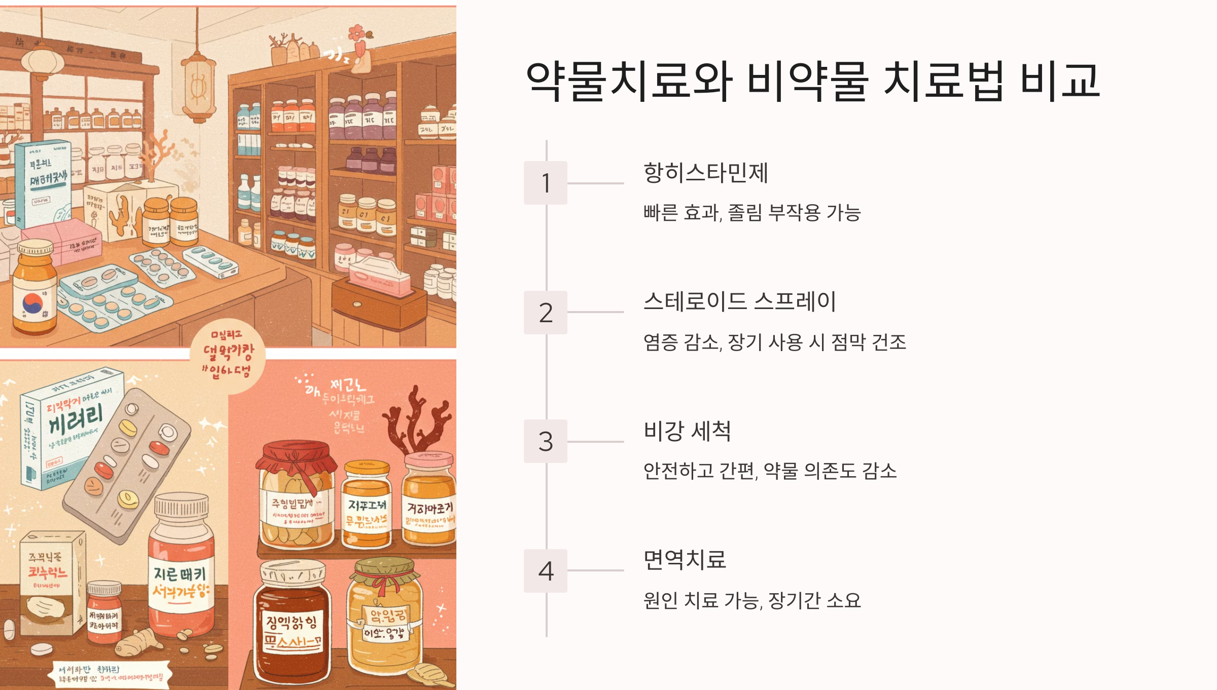 비염 치료는 단기 대처와 장기 관리가 병행돼야 해요. 급할 땐 약의 도움을 받되, 꾸준한 생활관리와 비약물 요법으로 점점 약을 줄여가는 방향이 가장 좋아요 💡