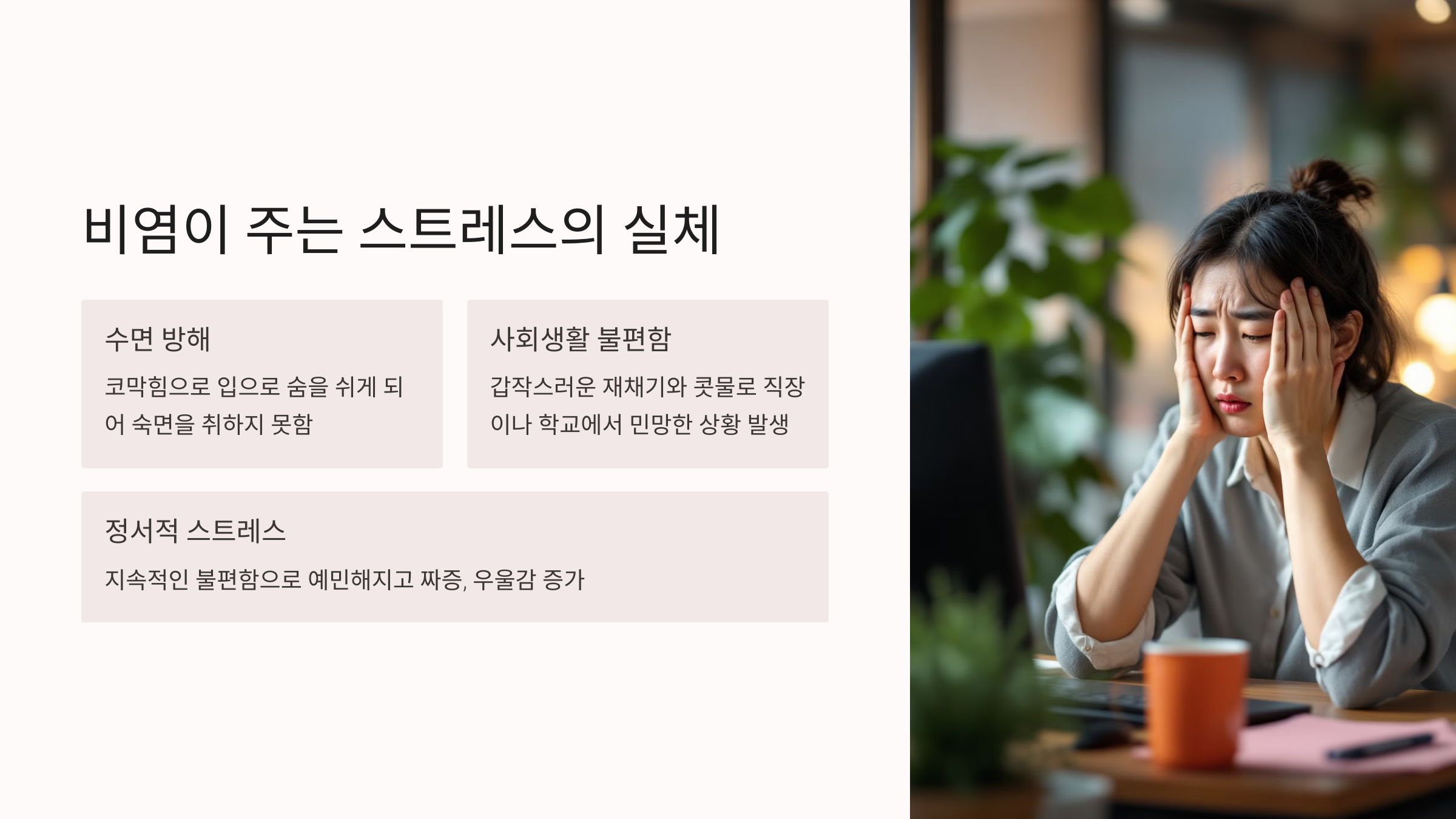 첫 번째 스트레스는 ‘수면 방해’예요. 밤새 코가 막히면 입으로 숨 쉬게 되고, 이 때문에 자주 깨거나 숙면을 못 하게 돼요. 피곤함은 물론, 아침에 머리가 멍하고, 하루 종일 집중이 잘 안 되죠.