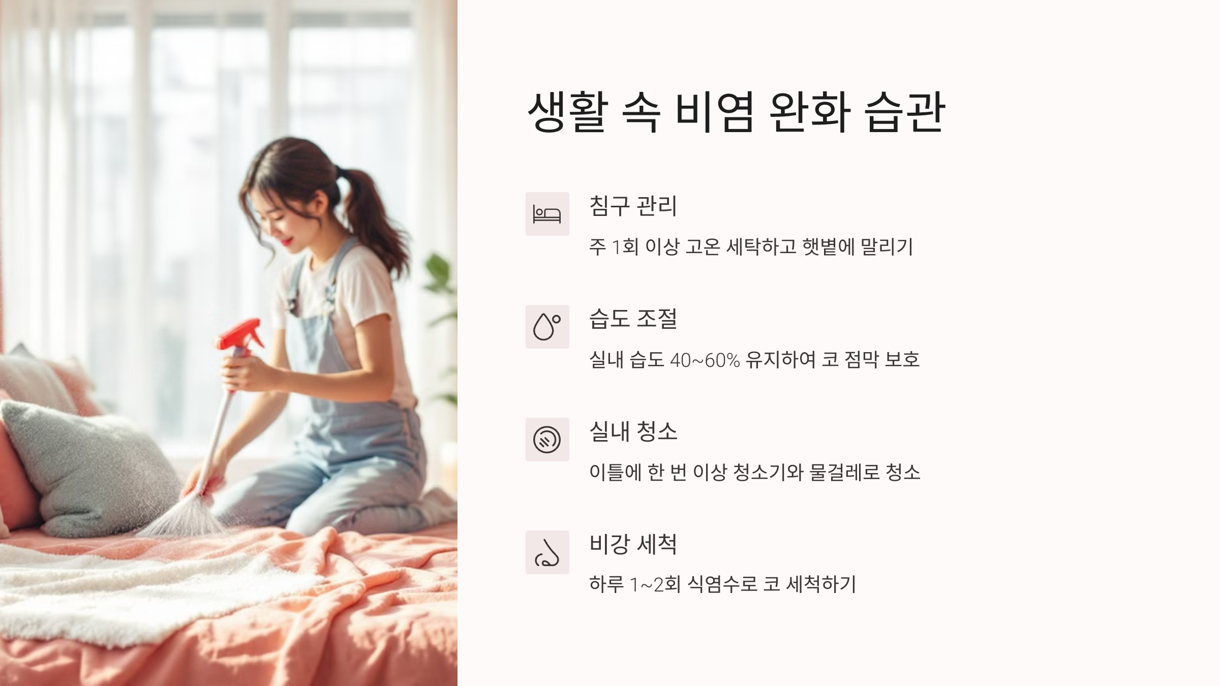 비염은 약만으로 해결되지 않아요. 일상 속 작은 습관들이 모여야 진짜 개선이 가능해요. 특히 알레르기성 비염이라면 생활환경을 바꾸는 것만으로도 증상이 훨씬 줄어들 수 있어요. 지금 당장 실천할 수 있는 것들부터 소개할게요.